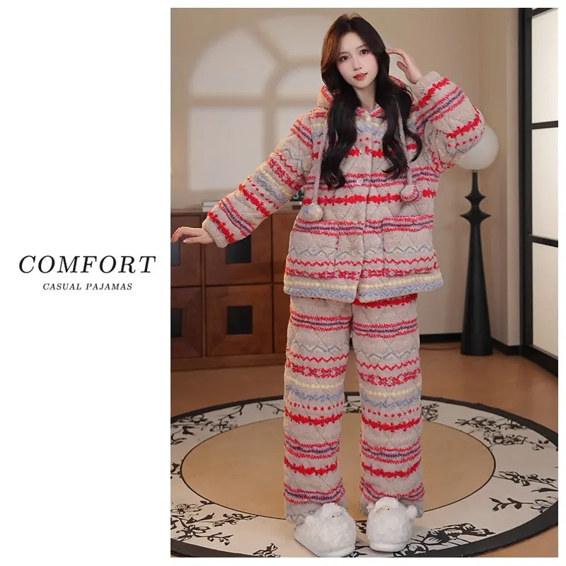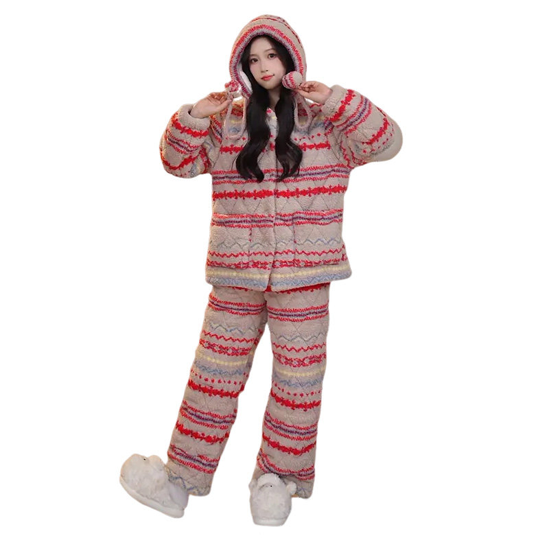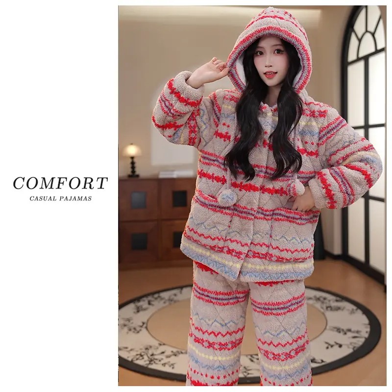 珊瑚绒睡衣女款冬季2025新款三层夹棉加厚费尔岛女士可外穿家居服