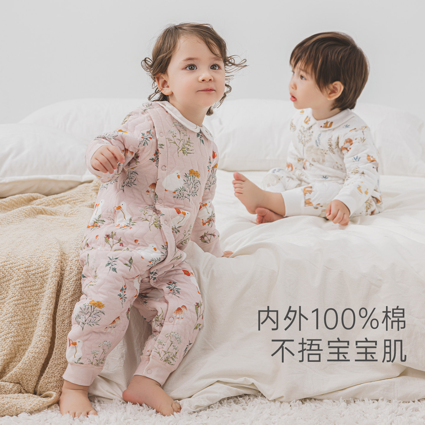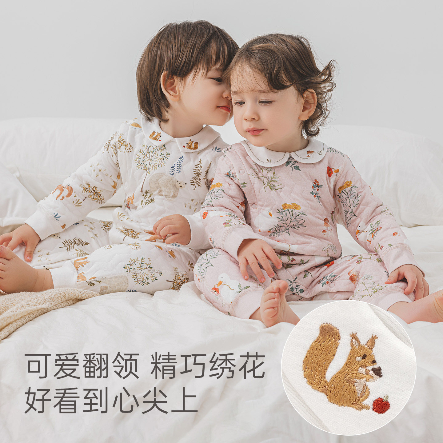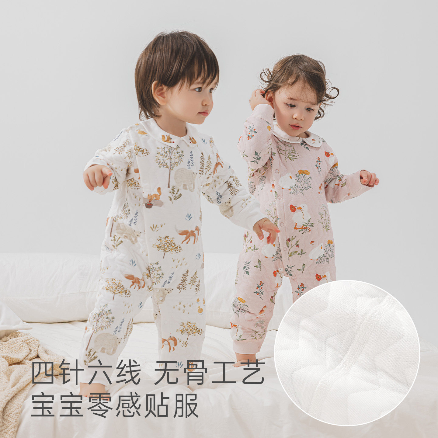 木生棉宝宝长袖连体衣冬季婴儿三层夹丝保暖衣服居家睡衣哈衣爬服