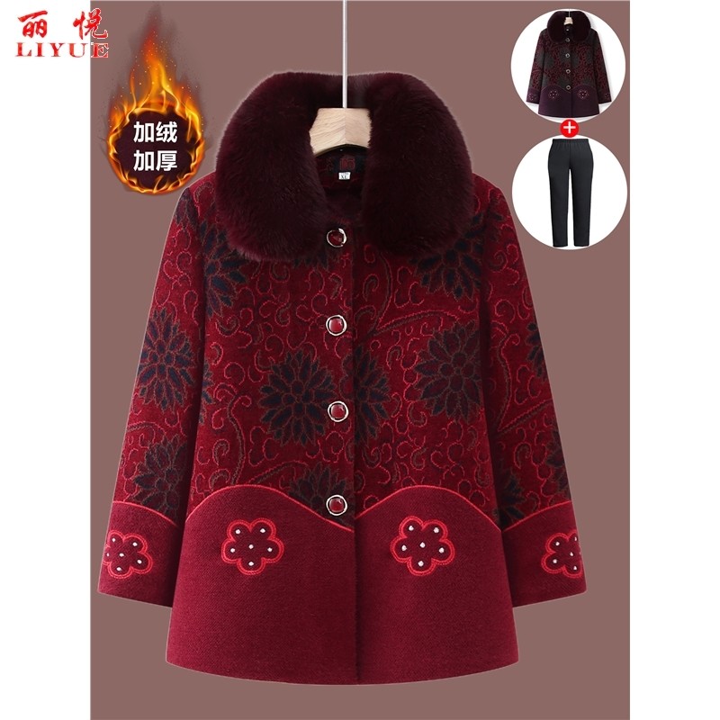妈妈秋冬季加绒外套女中老年人大码宽松翻领棉衣三层加厚棉服上衣