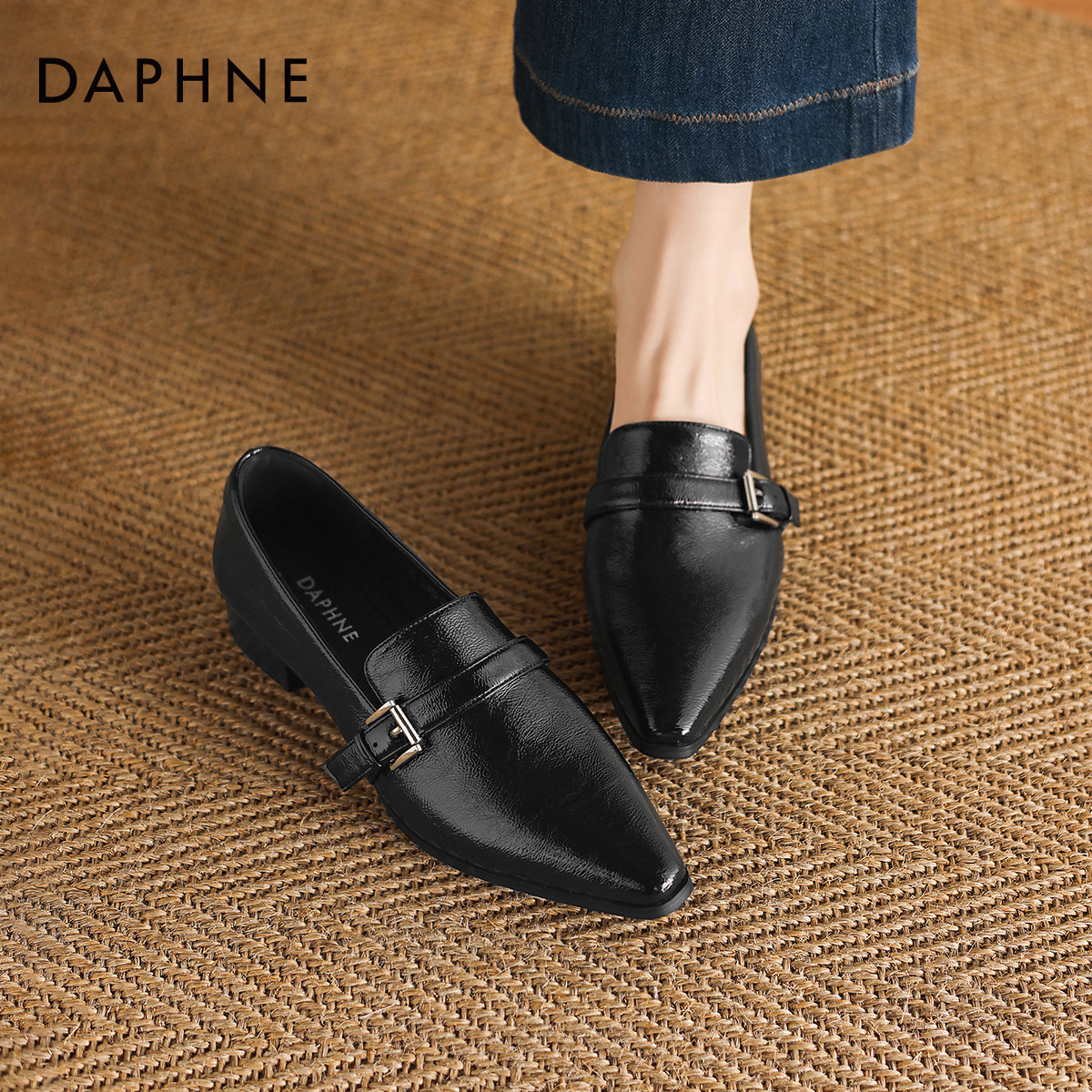 达芙妮乐福鞋女款尖头单鞋2026新款春季英伦风粗跟黑色皮鞋平底鞋