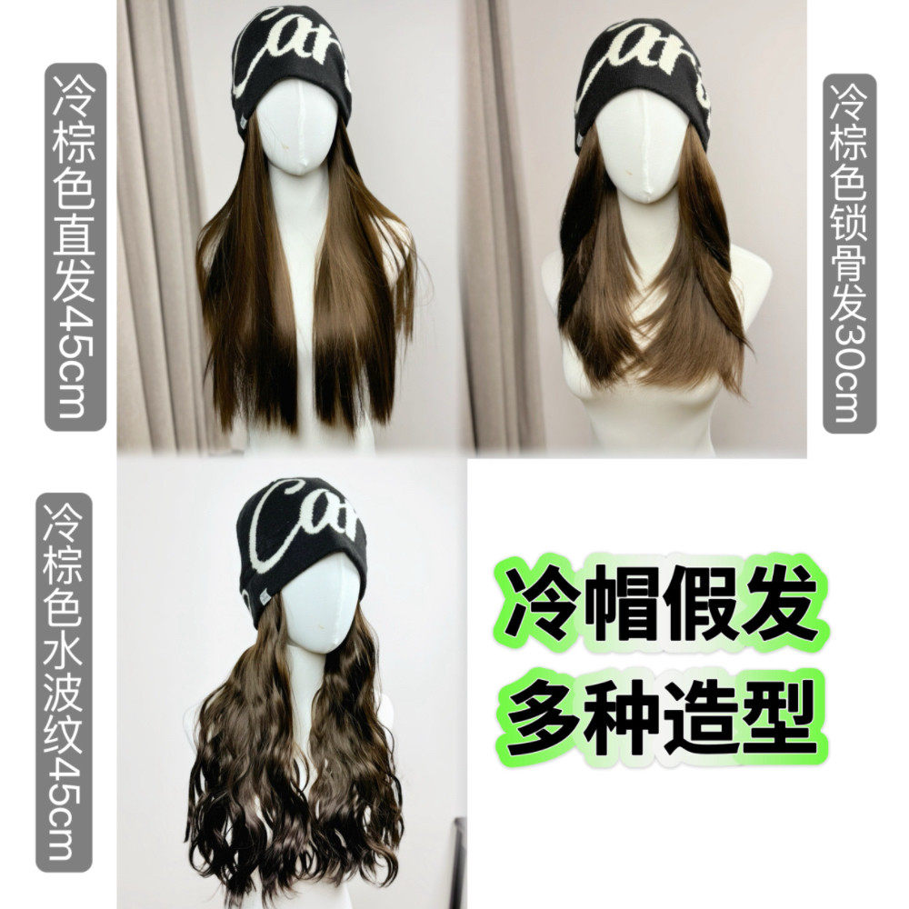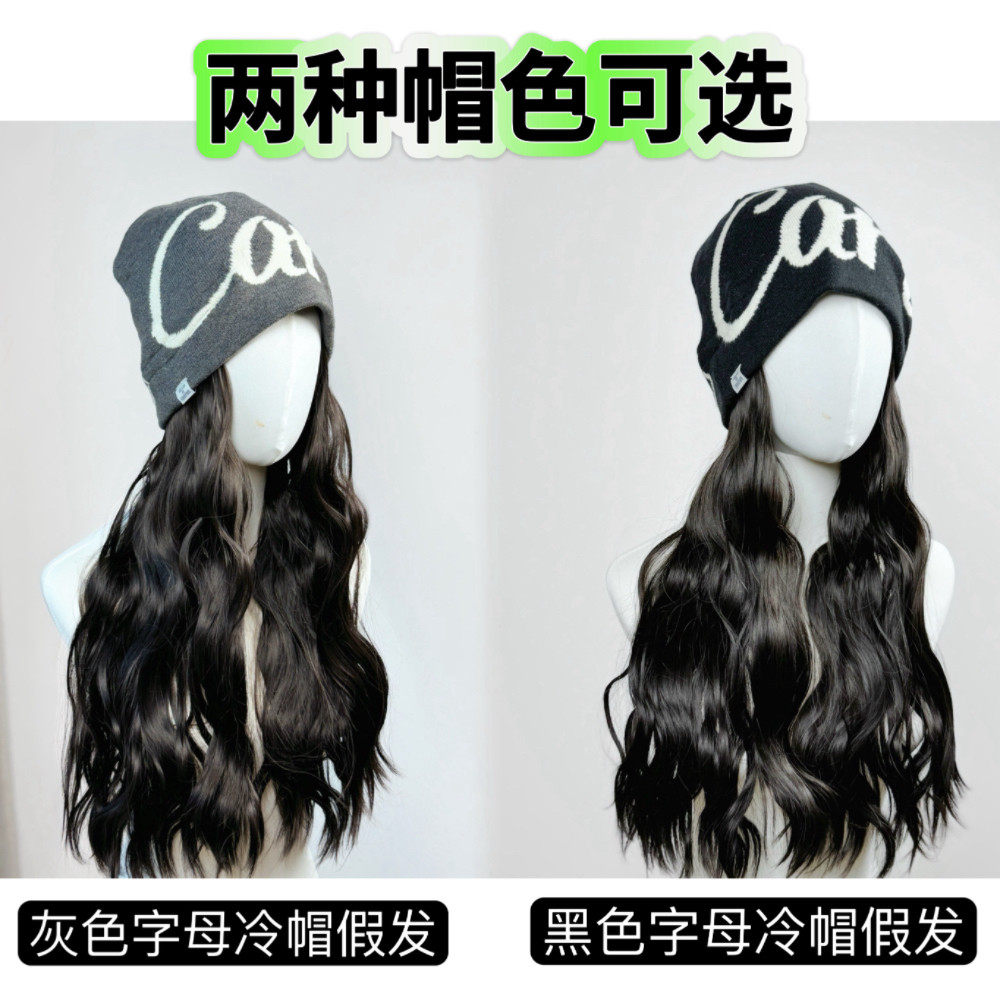 美式潮冷帽假发女长发秋冬帽子假发一体毛线帽滑雪堆堆帽整头假发