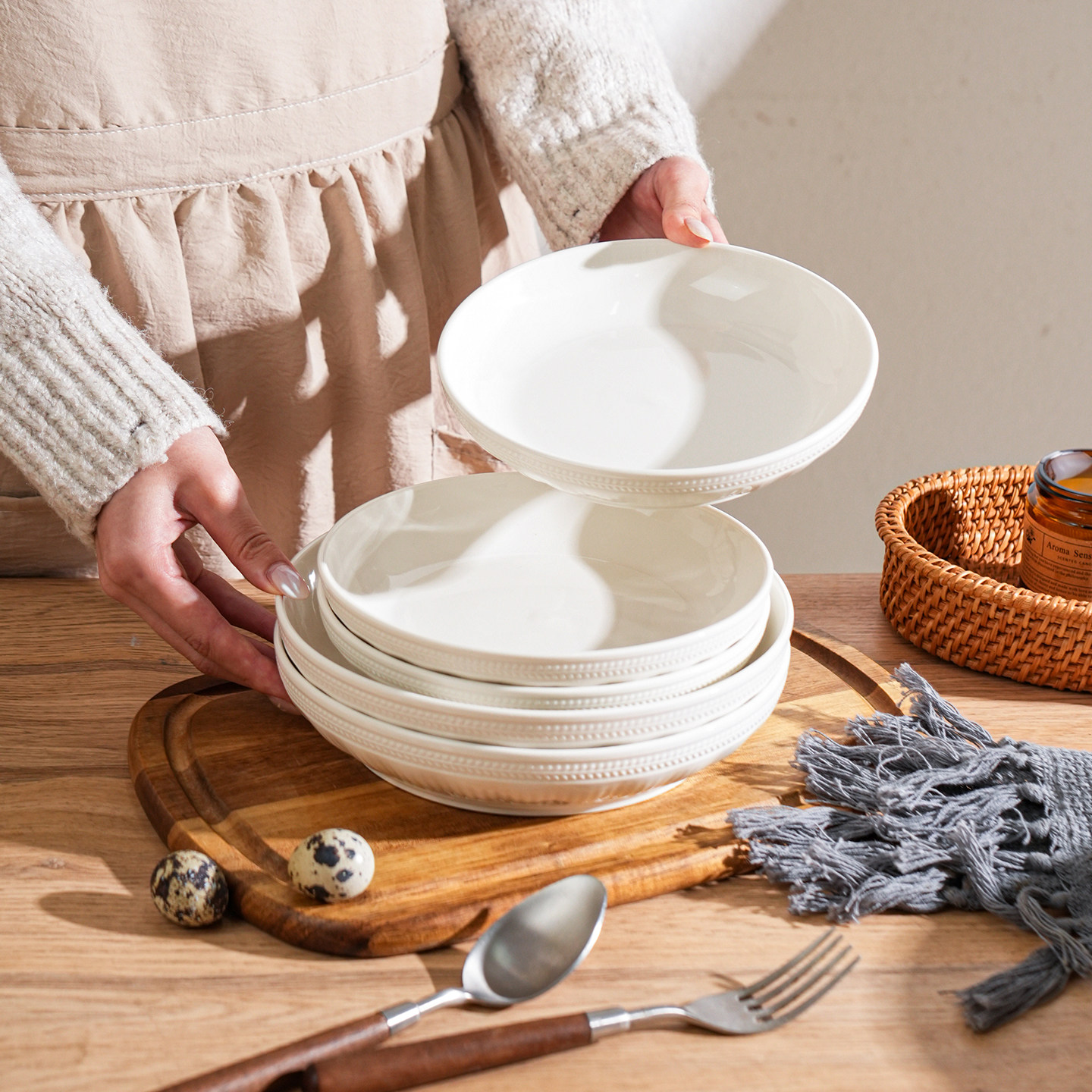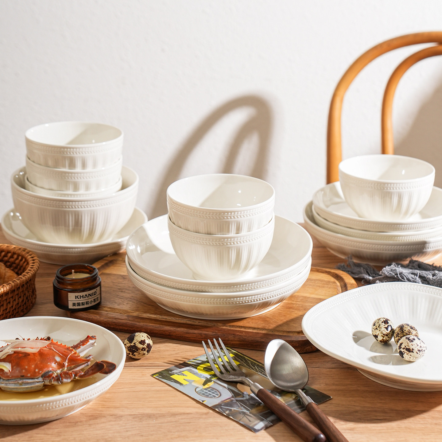 舍里纯白简约陶瓷米饭碗高颜值碗碟套装家用高档浮雕碗盘西餐盘子