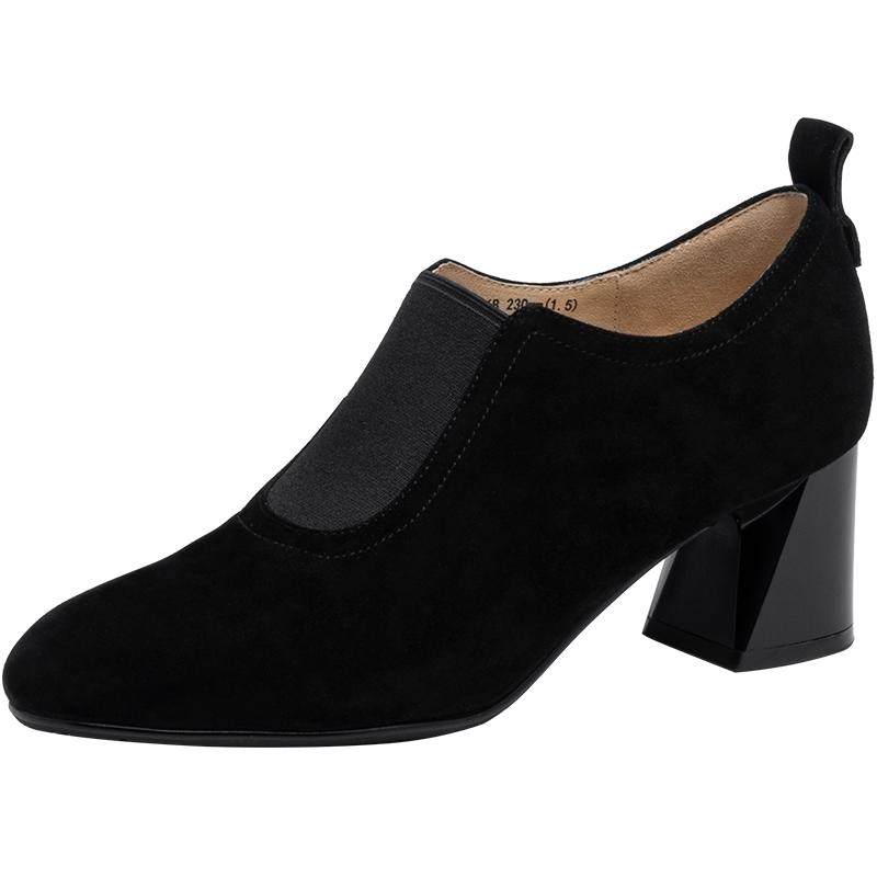 沙驰女鞋中跟粗跟羊皮单鞋女深口2025年秋冬新款时尚通勤时装靴