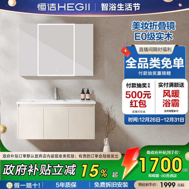 恒洁卫浴现代浴室柜陶瓷一体盆奶油风卫生间洗脸盆柜组合智能镜柜