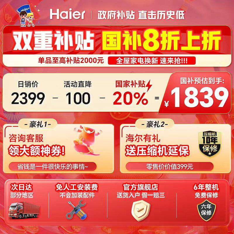 政府补贴海尔空调1.5匹优恋一级能效变频家用空调挂机旗舰店98