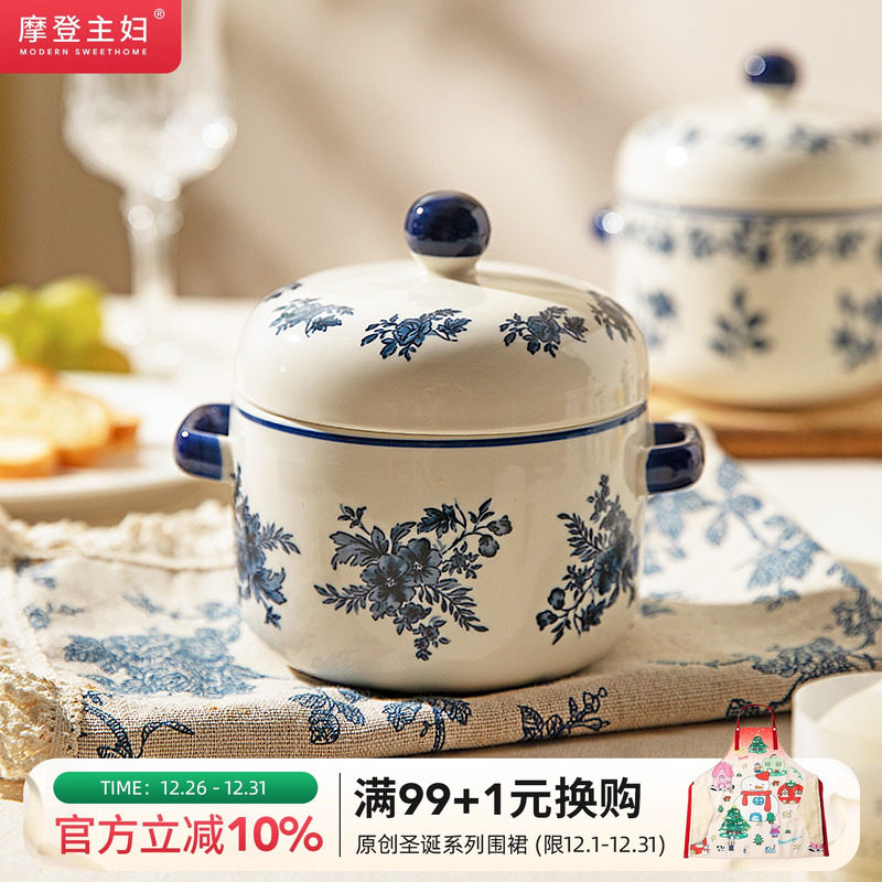 摩登主妇蓝黛庄园炖盅隔水家用陶瓷蒸盅炖罐一人份燕窝煲汤小瓦罐