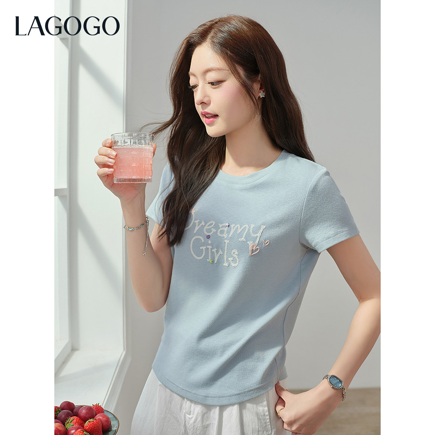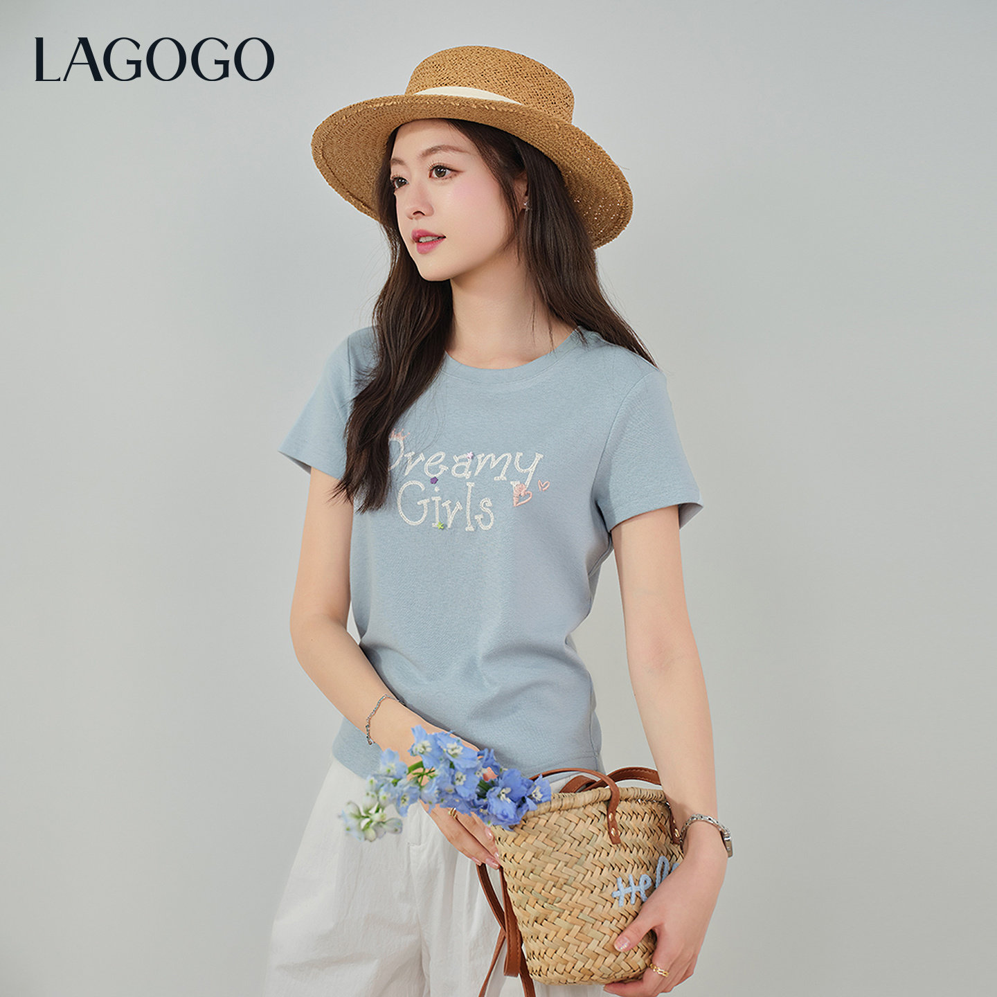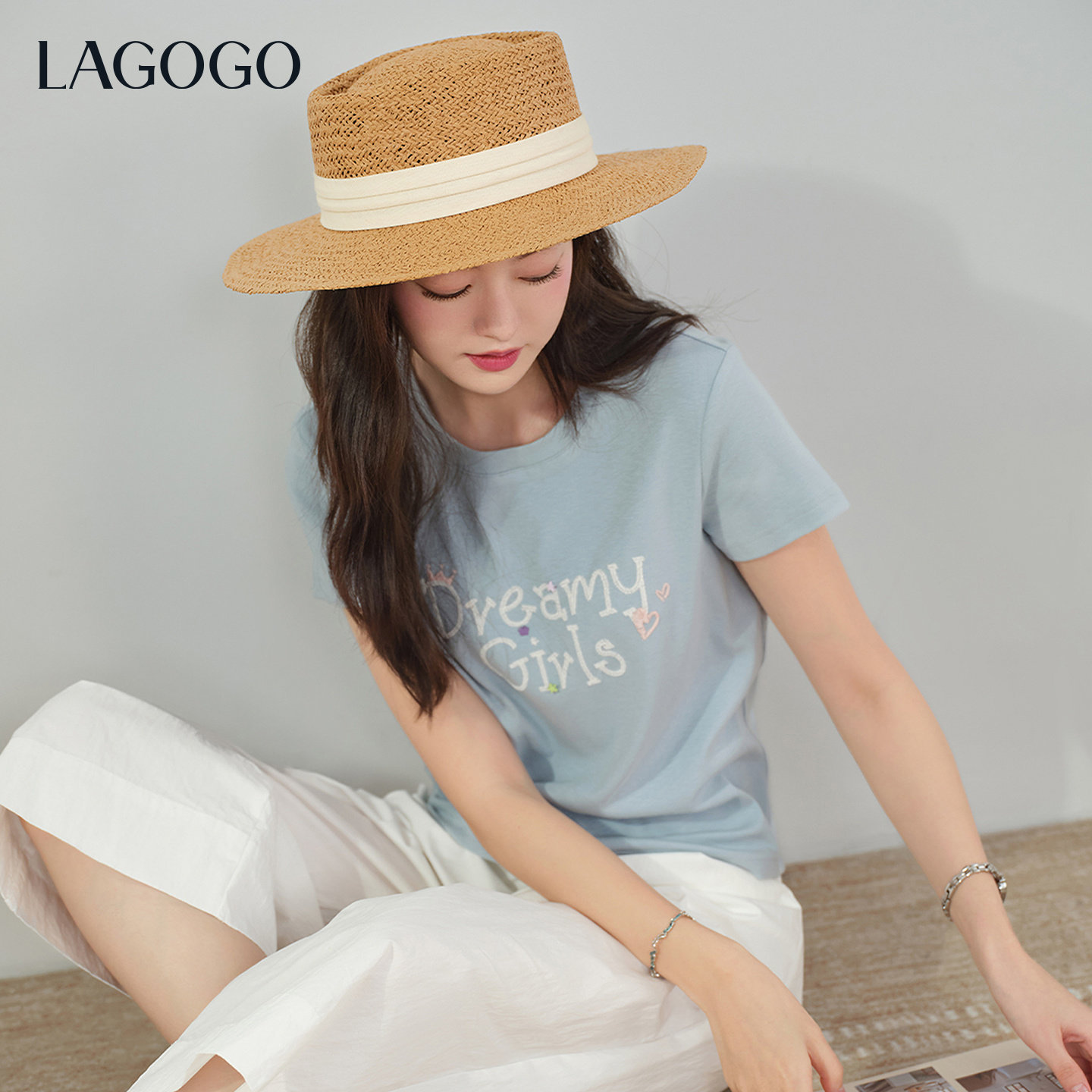 LAGOGO少女星愿甜美正肩T恤女拉谷谷2026年夏新款字母刺绣上衣