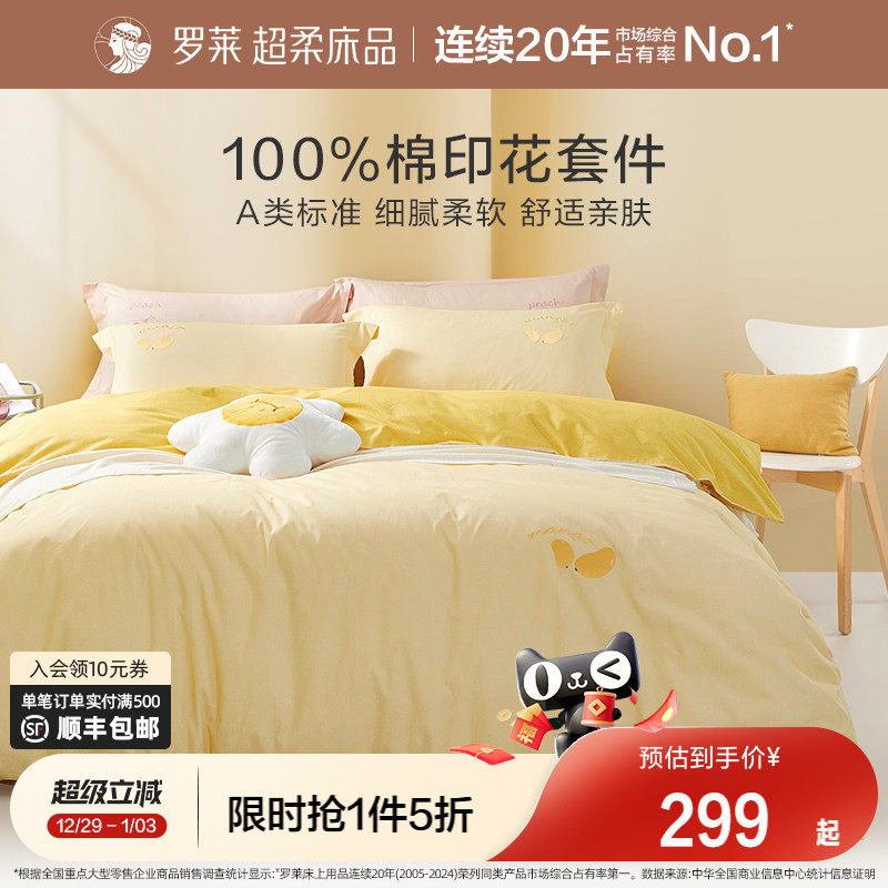 罗莱家纺全棉四件套床单被套被罩春秋纯棉床上学生宿舍单人三件套