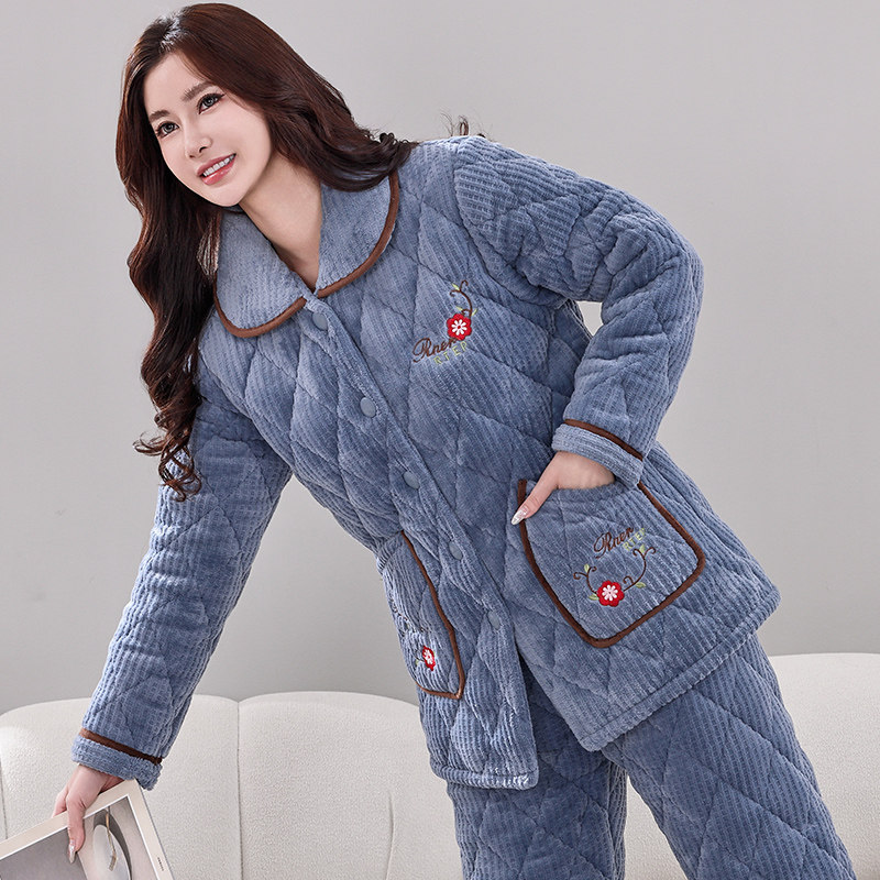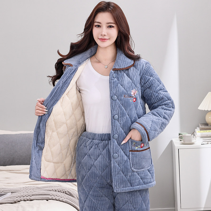 冬季睡衣女加厚加绒珊瑚绒三层夹棉中老年保暖家居服秋冬款妈妈装