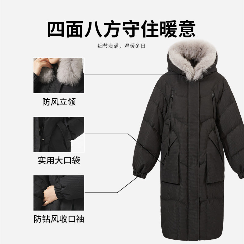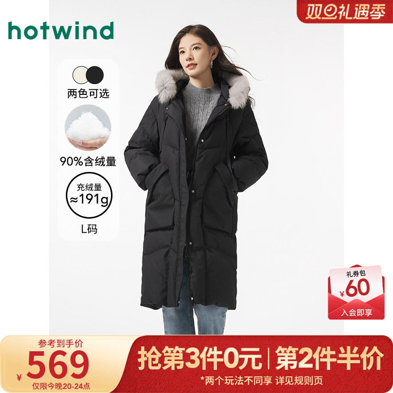 热风2024年冬季新款女士学院风羽绒服百搭舒适毛领连帽长款羽绒服