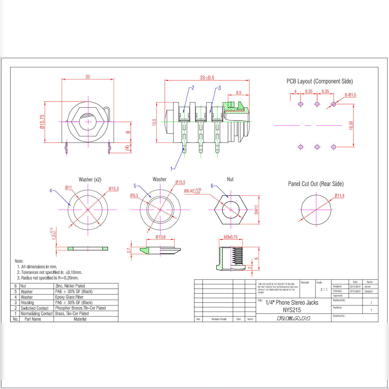 REAN原装全镀金耳机插座6.35mm口径 兼容6.5MM底座PCB焊接
