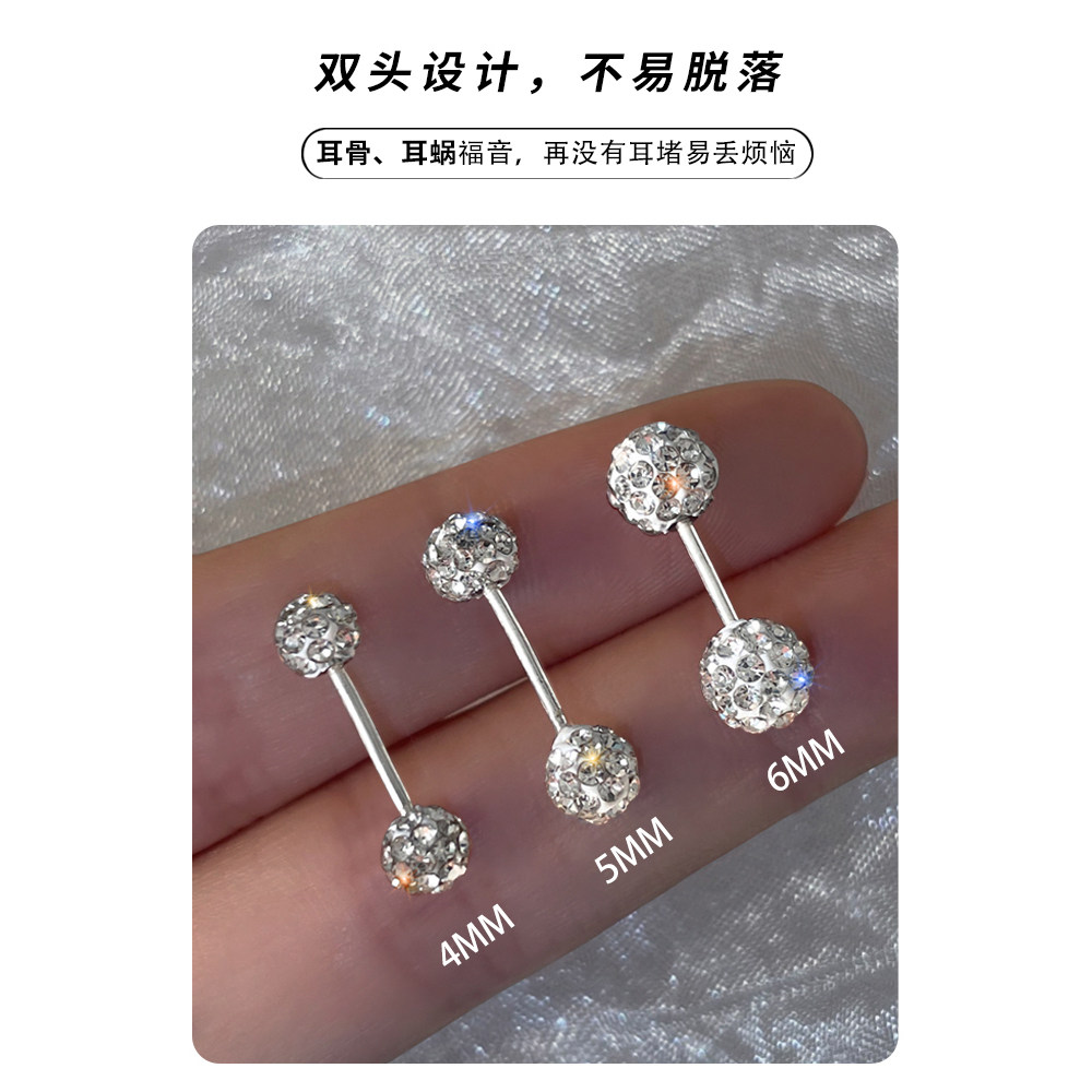 S925纯银针耳钉女双头精致闪锆养耳洞耳骨钉小众高级感耳蜗钉耳饰