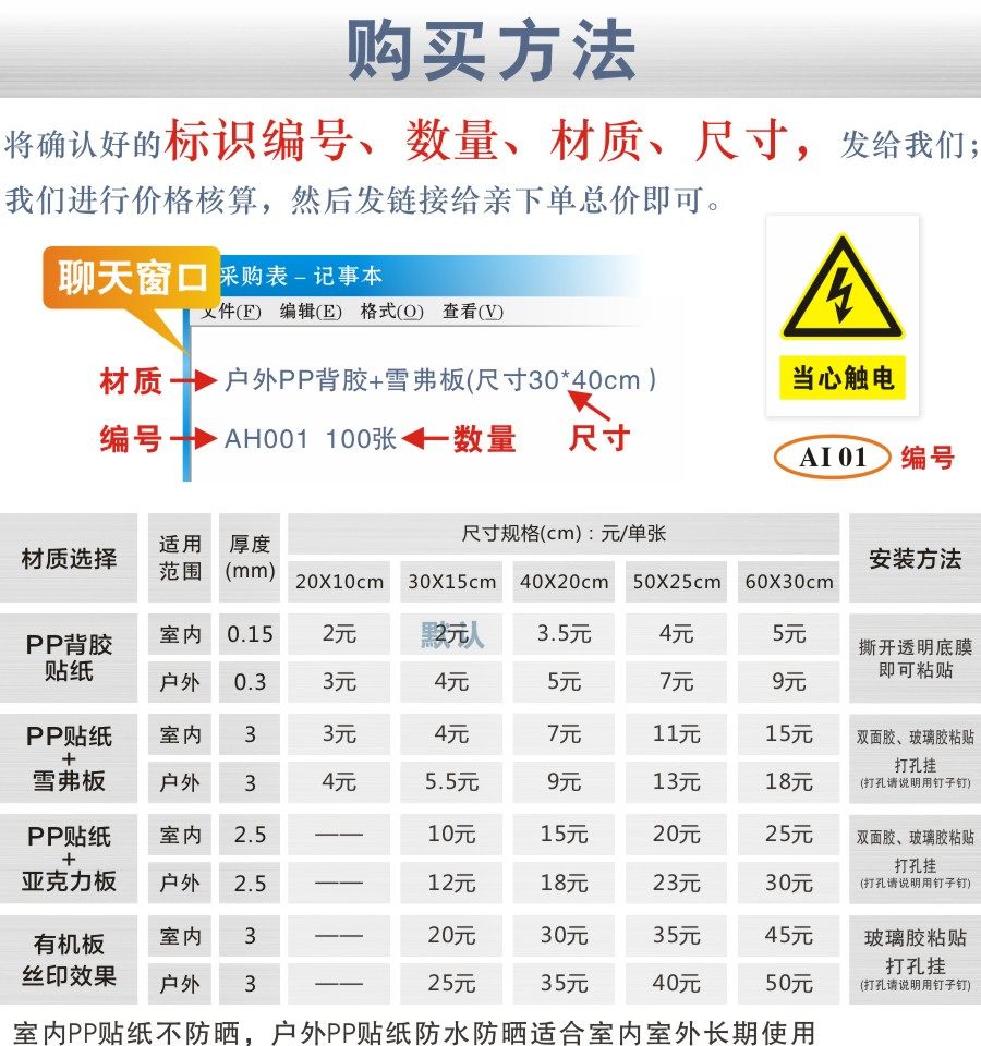 标价2元是一张 PP背胶贴纸 15*30cm 的价格,更多材质请查看详情。- - - - - - - - - - - - 【购买方法】→①挑选好"编号"数量"→②确认好"材质"尺寸"。→③将"编号"数量"材质"尺寸"发给我们。→④我们进行价格核算, 然后发链接给亲拍下总价即可