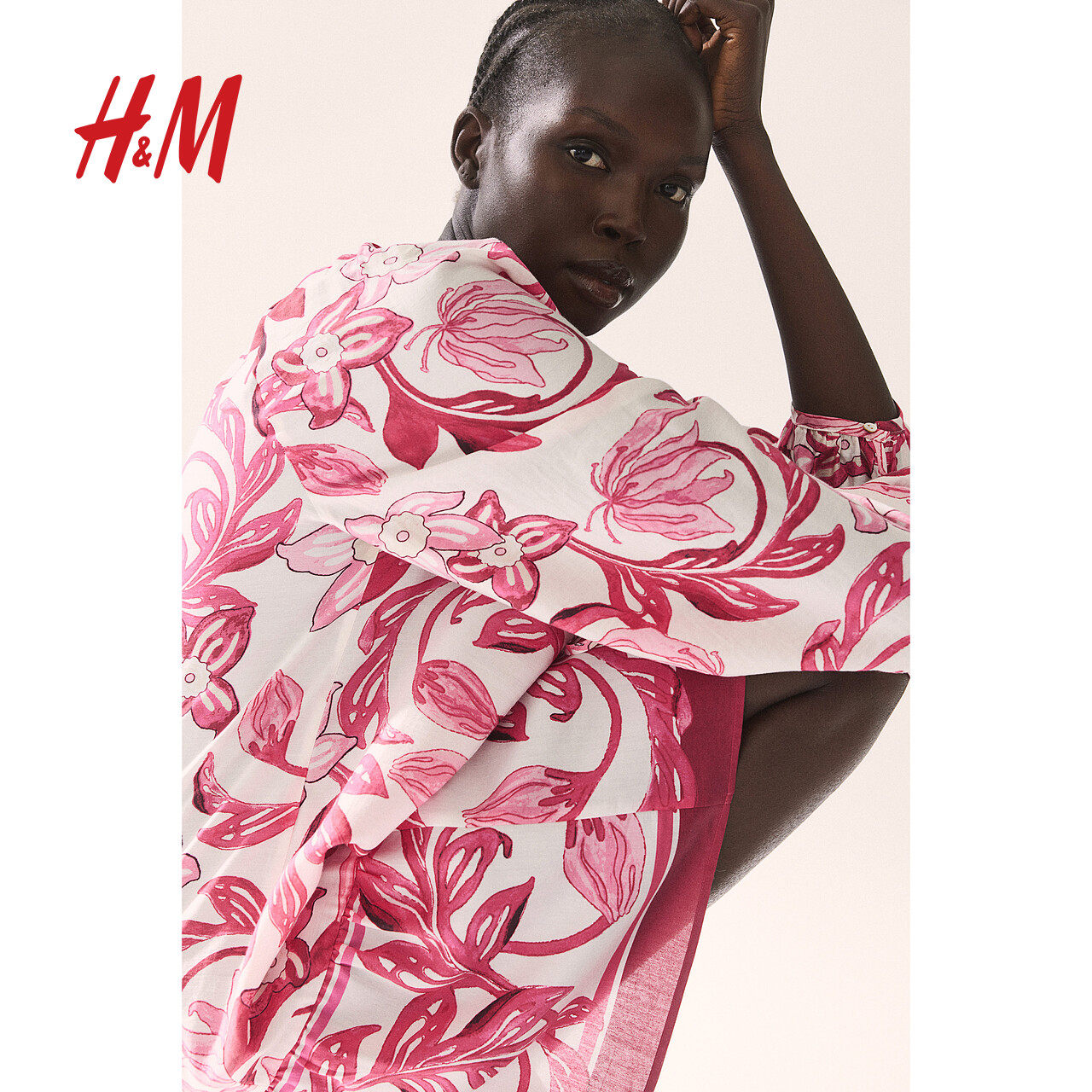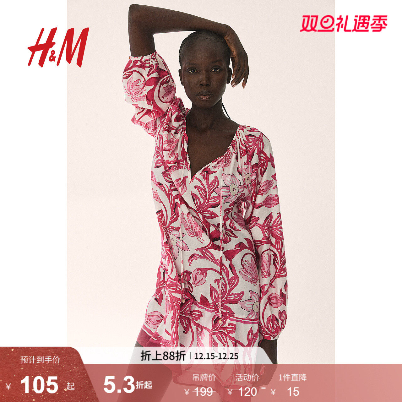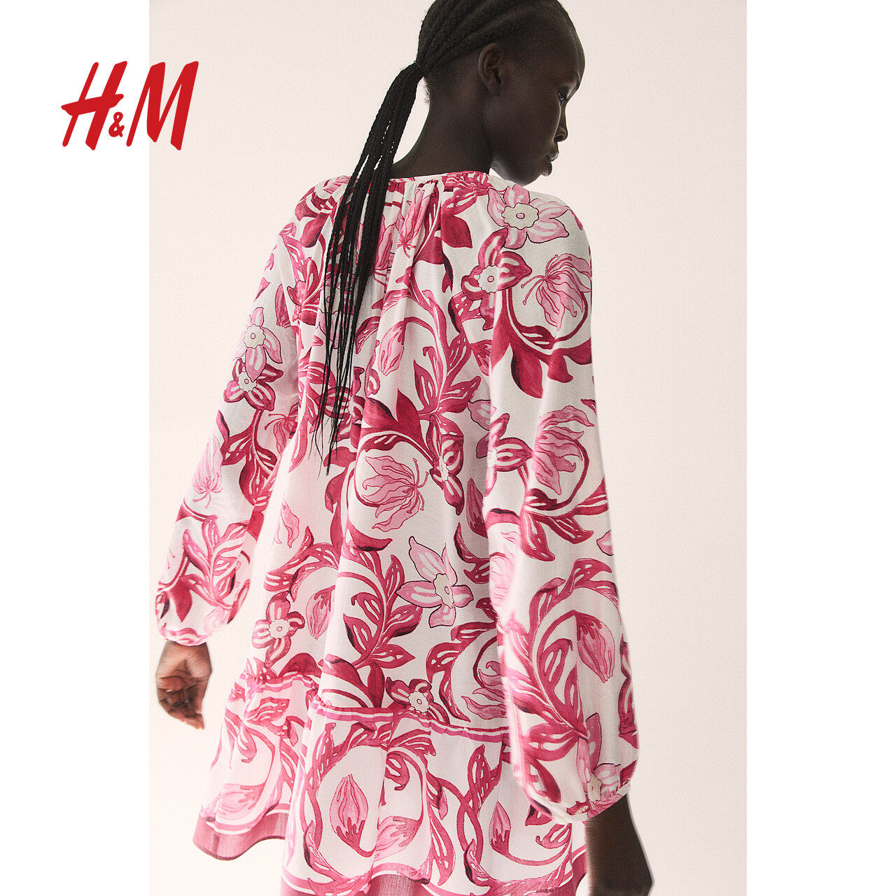 HM女装花卉连衣裙秋季法式宽松圆领印花灯笼长袖系带短裙1217790
