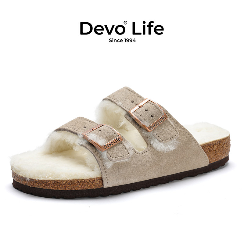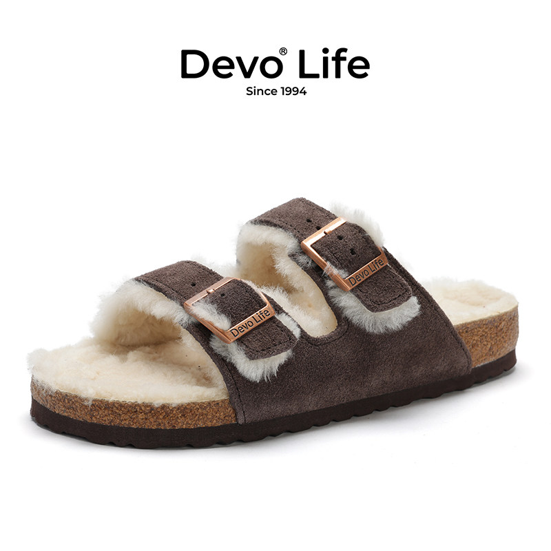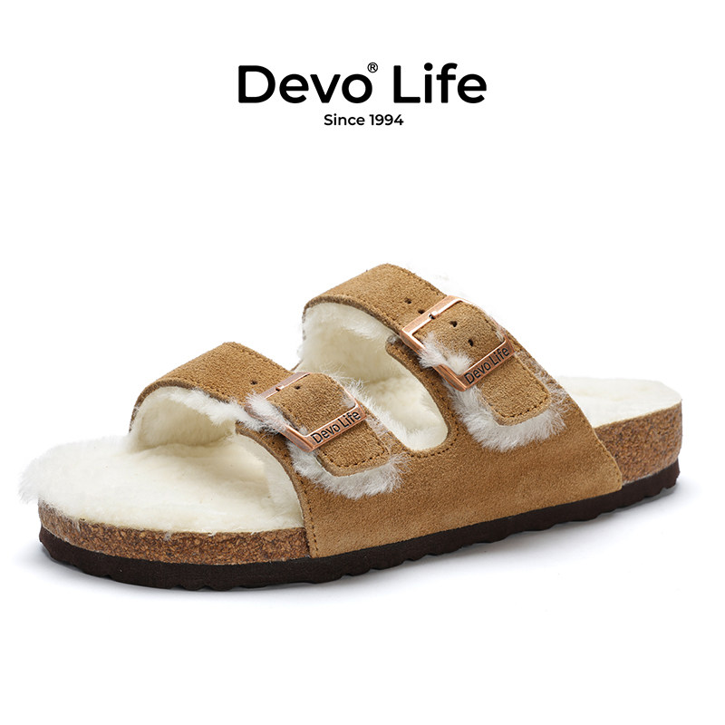 Devo/的沃女休闲外穿加毛内里保暖外穿加绒冬季一字软木拖鞋56018