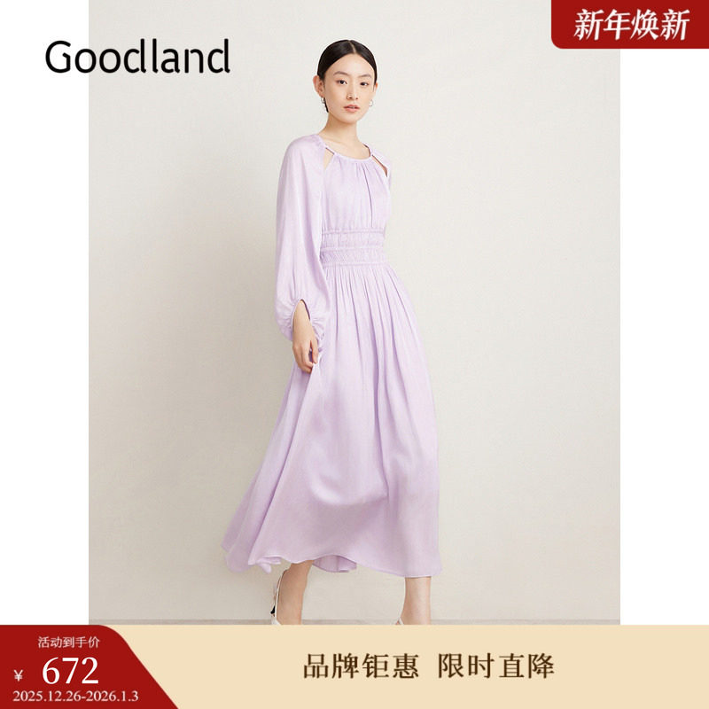 Goodland美地女装春季法式优雅海岛丝仙女裙褶裥连衣裙