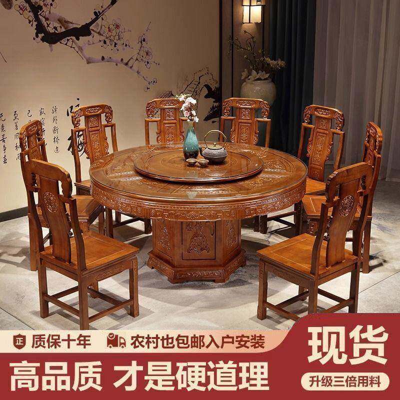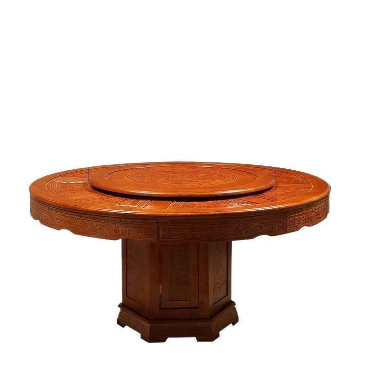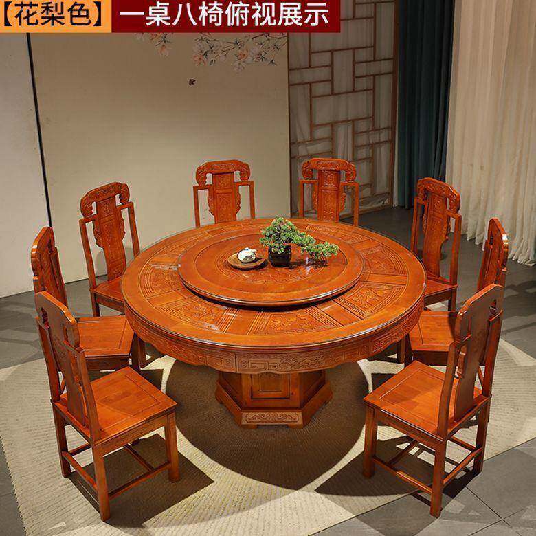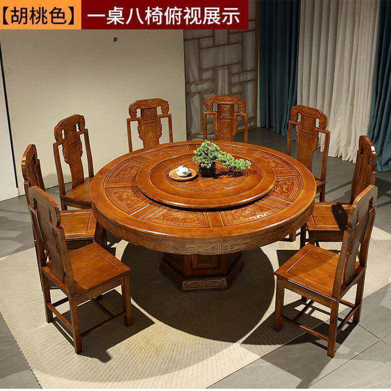 明清中式仿古实木雕花餐桌椅组合带转盘可加电磁炉商用大圆桌家用