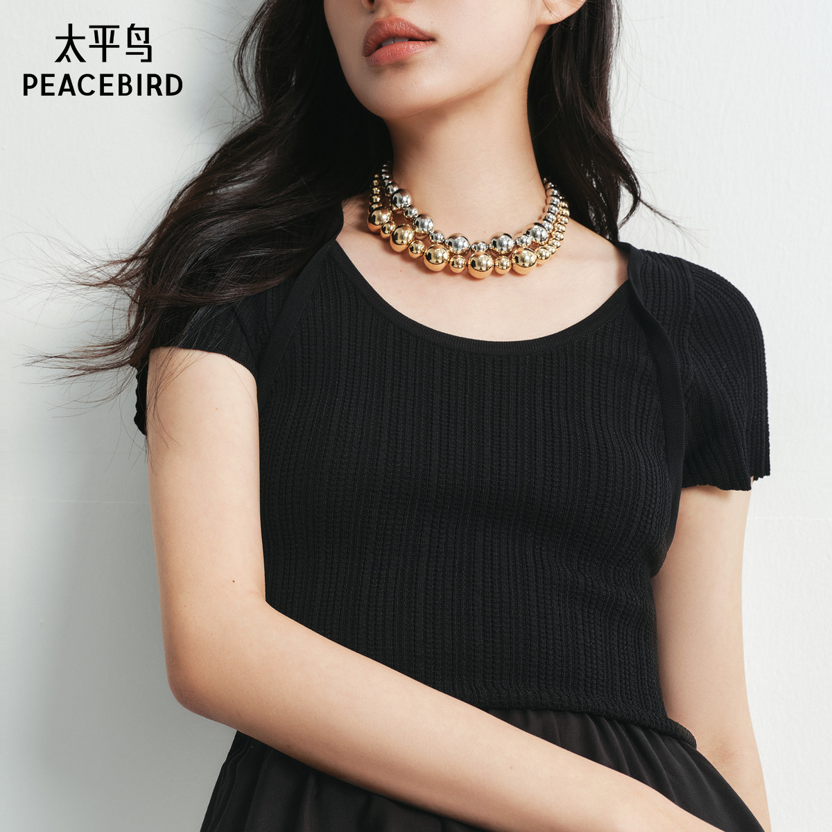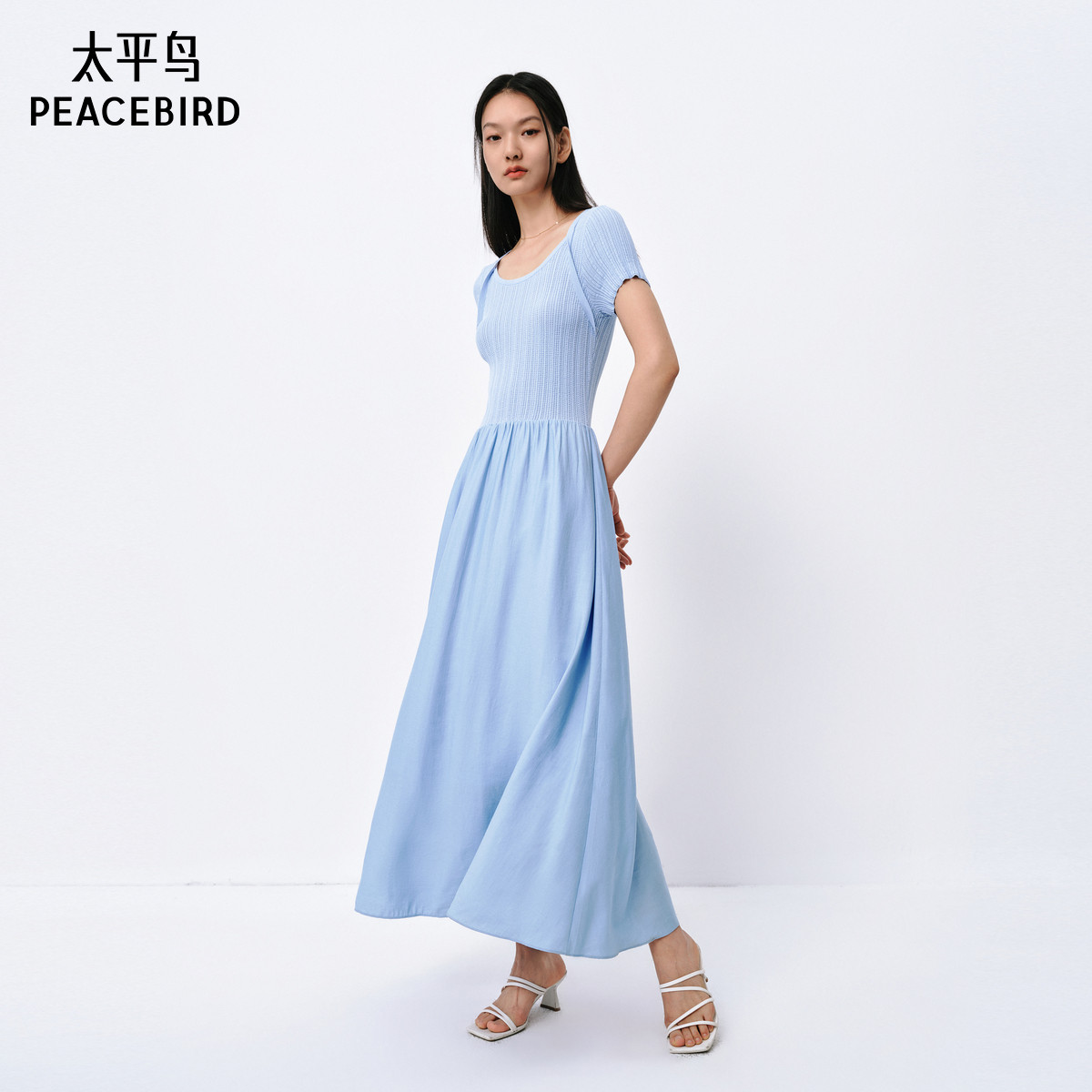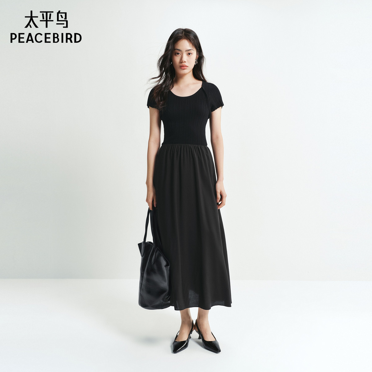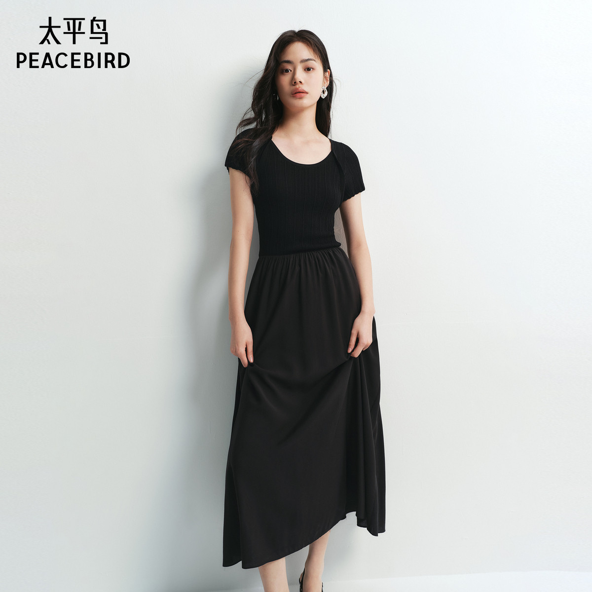 太平鸟拼接连衣裙女2025夏新款时尚针织裙短袖收腰假两件小黑裙
