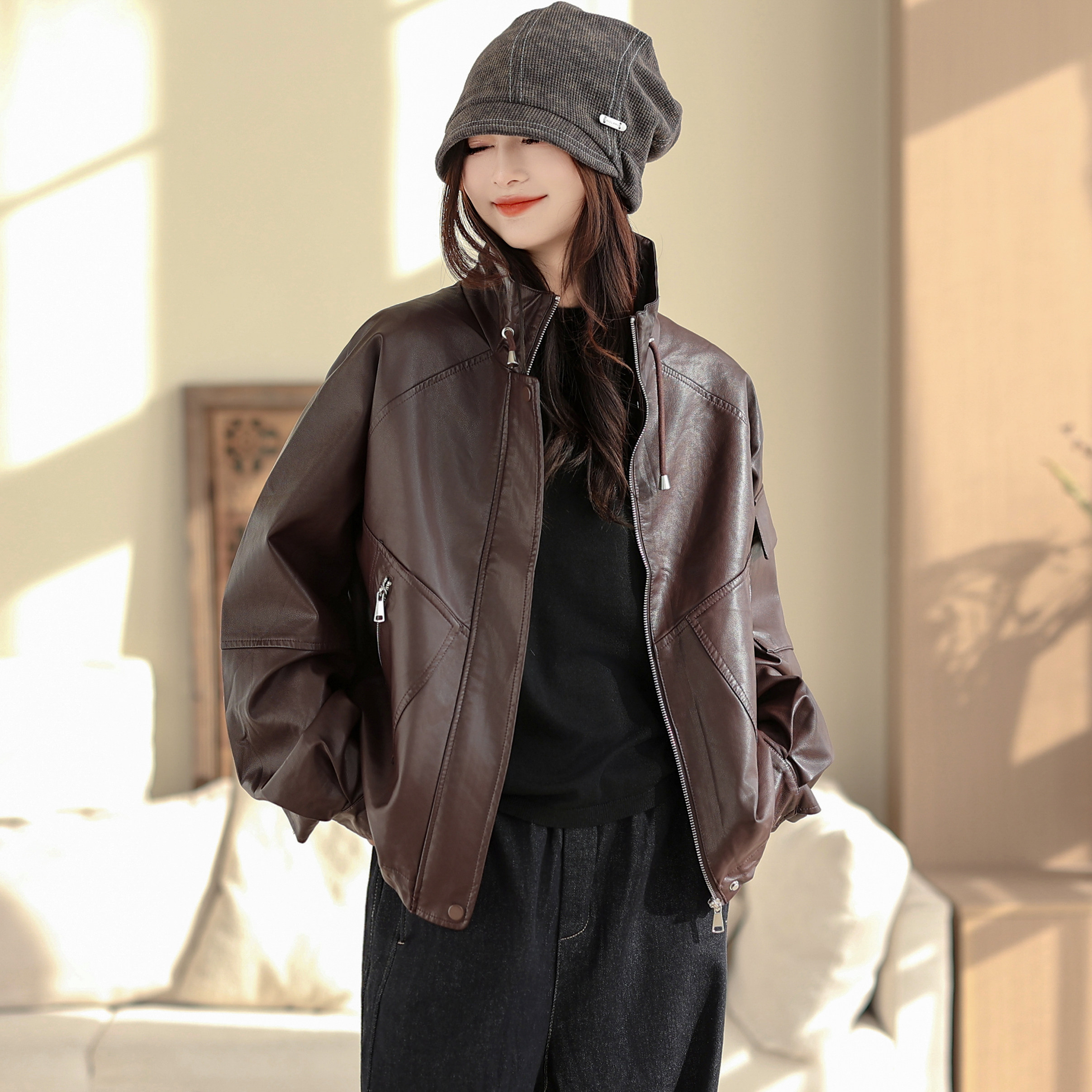 COCOBELLA安可拉红复古PU短款环保皮衣女秋质感哑光夹克PU3098-2