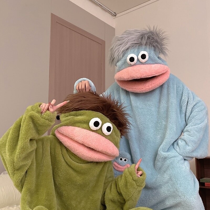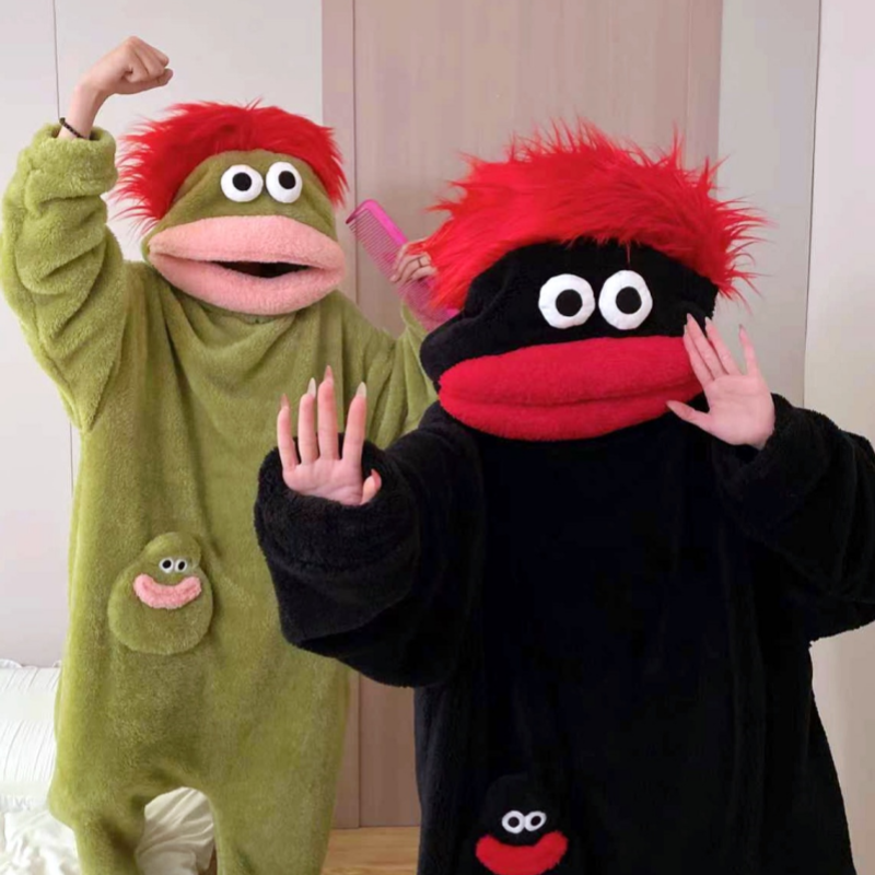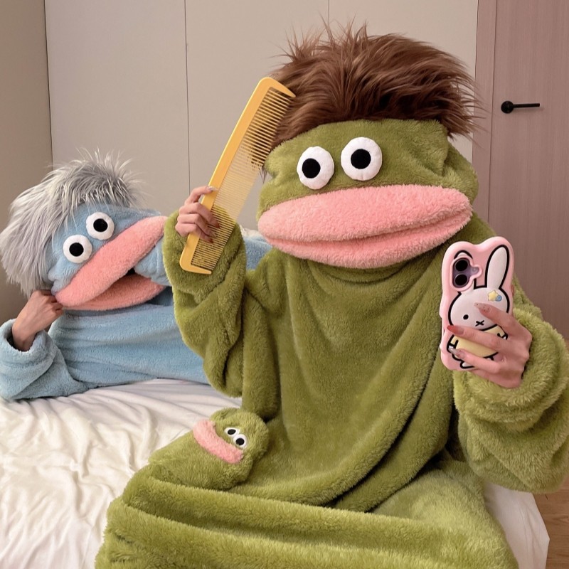 大嘴怪睡衣女珊瑚绒冬季加厚连体卡通搞怪抽象情侣丑鱼睡袍可外穿