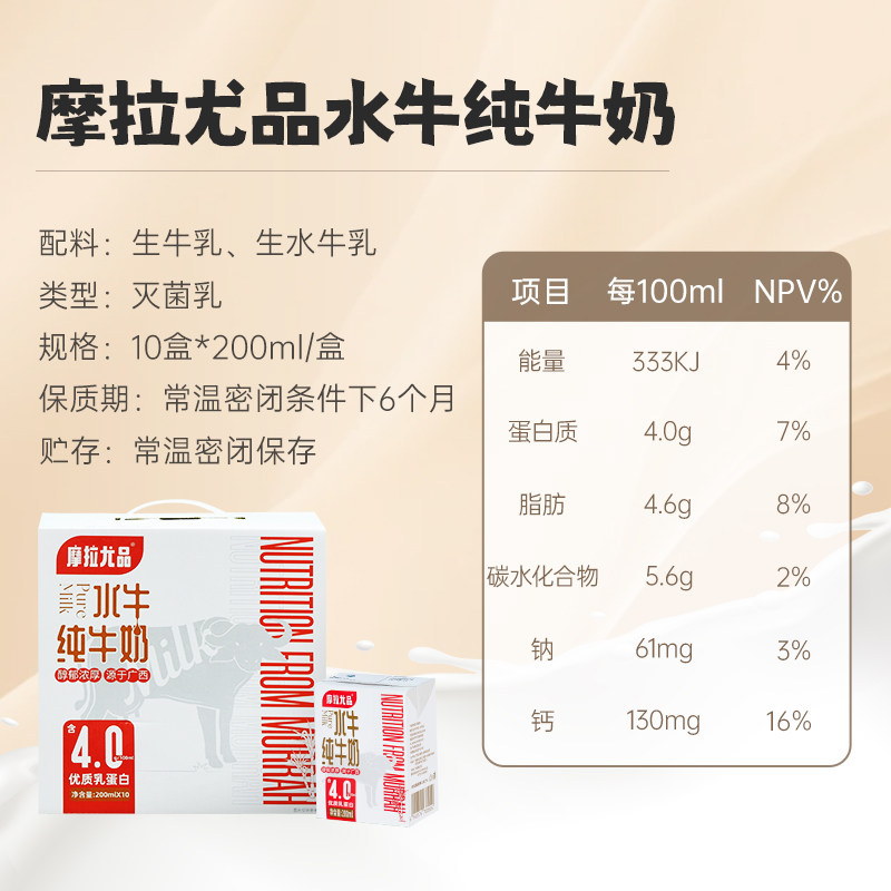 品鉴装摩拉尤品水牛纯牛奶200ml*2盒儿童学生营养早餐广西奶高钙