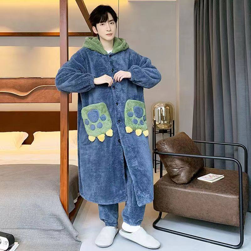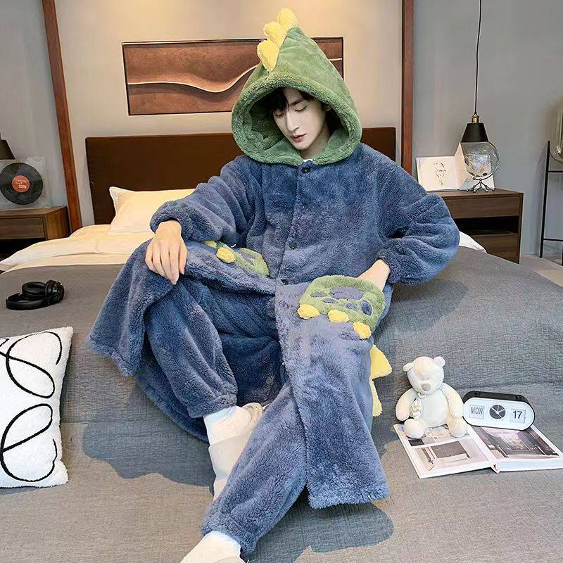 威伦缇男士睡衣秋冬珊瑚绒加厚加绒恐龙情侣长款大码睡袍绒类套装