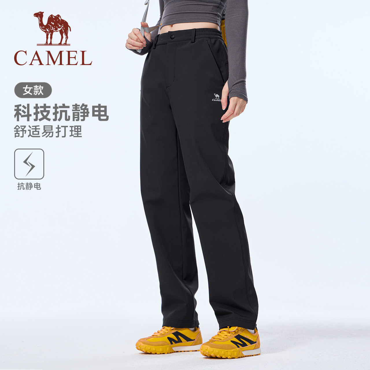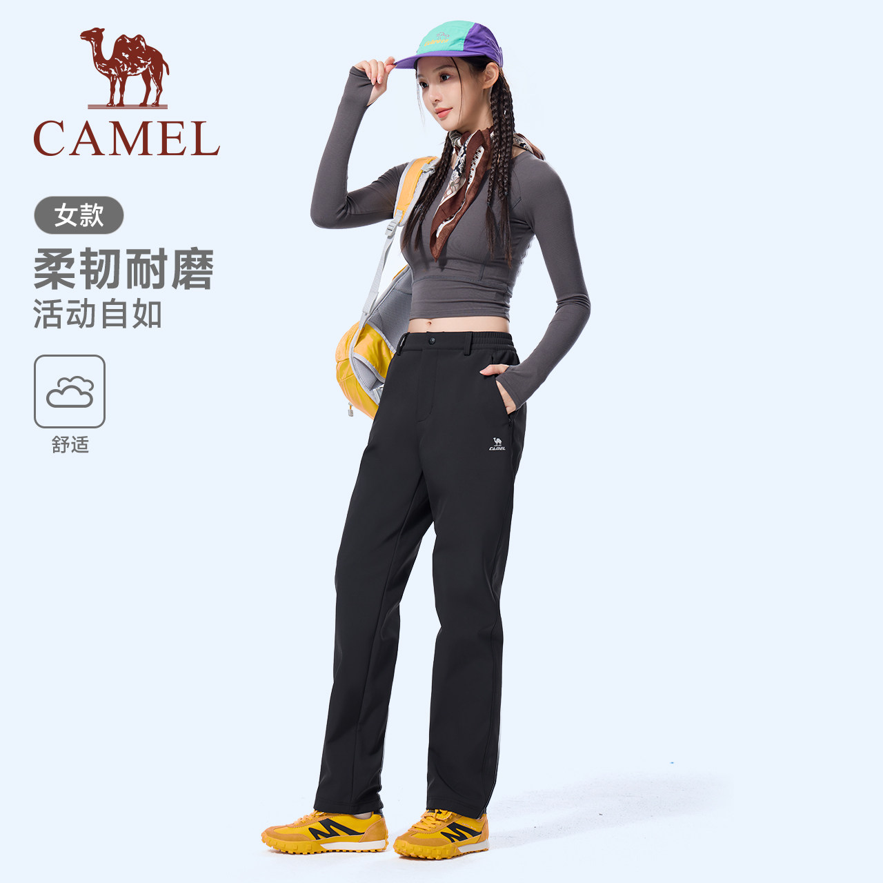 骆驼运动加绒裤女2025冬季直筒休闲宽松户外防泼工装软壳登山裤
