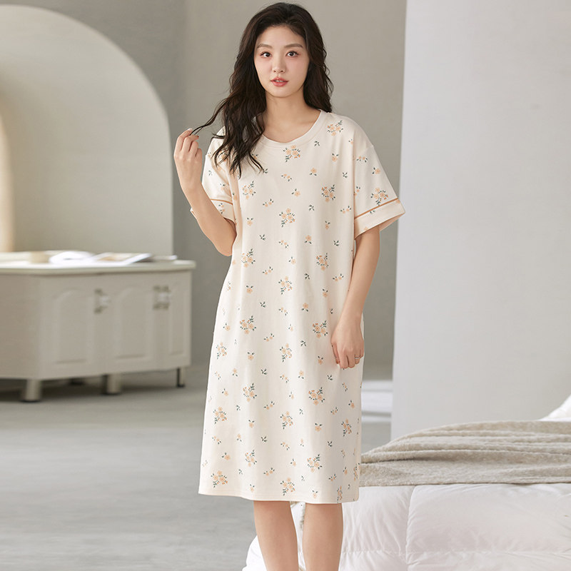 韩版加长款棉绸睡裙女士短袖加大码睡衣夏季人造棉宽松舒适居家服