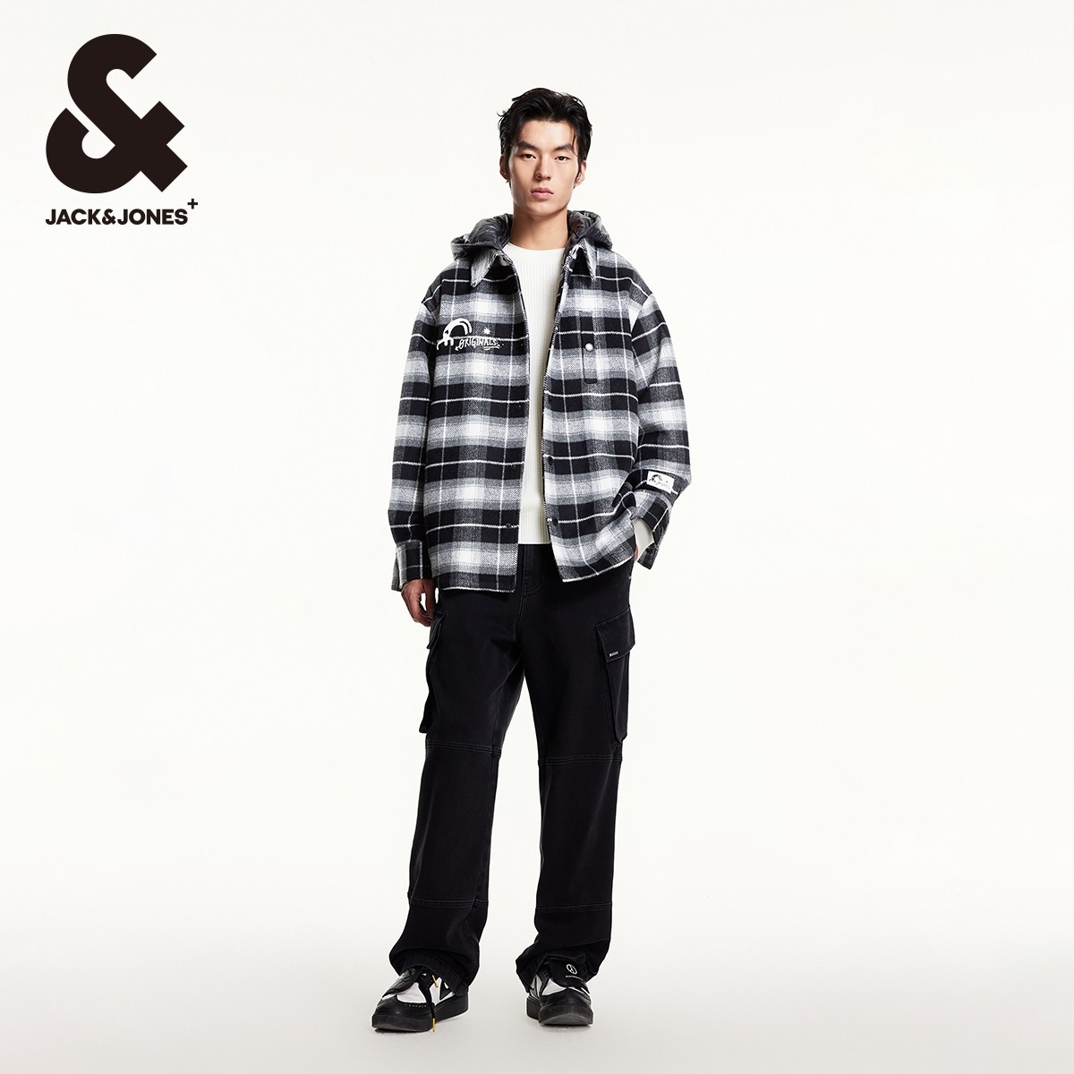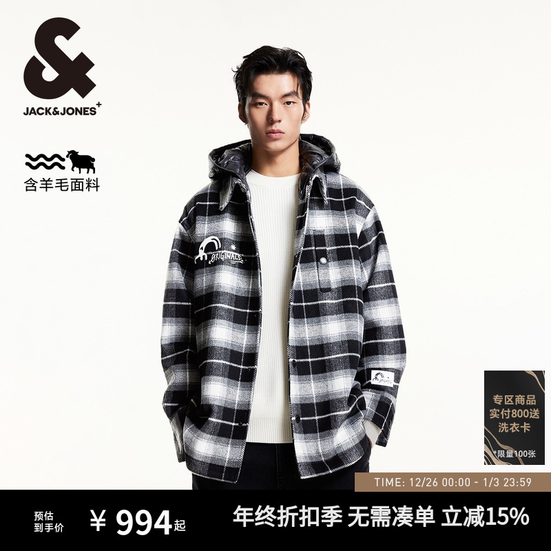 杰克琼斯男装秋冬新胸前字母刺绣图案潮流百搭可拆卸连帽毛呢大衣