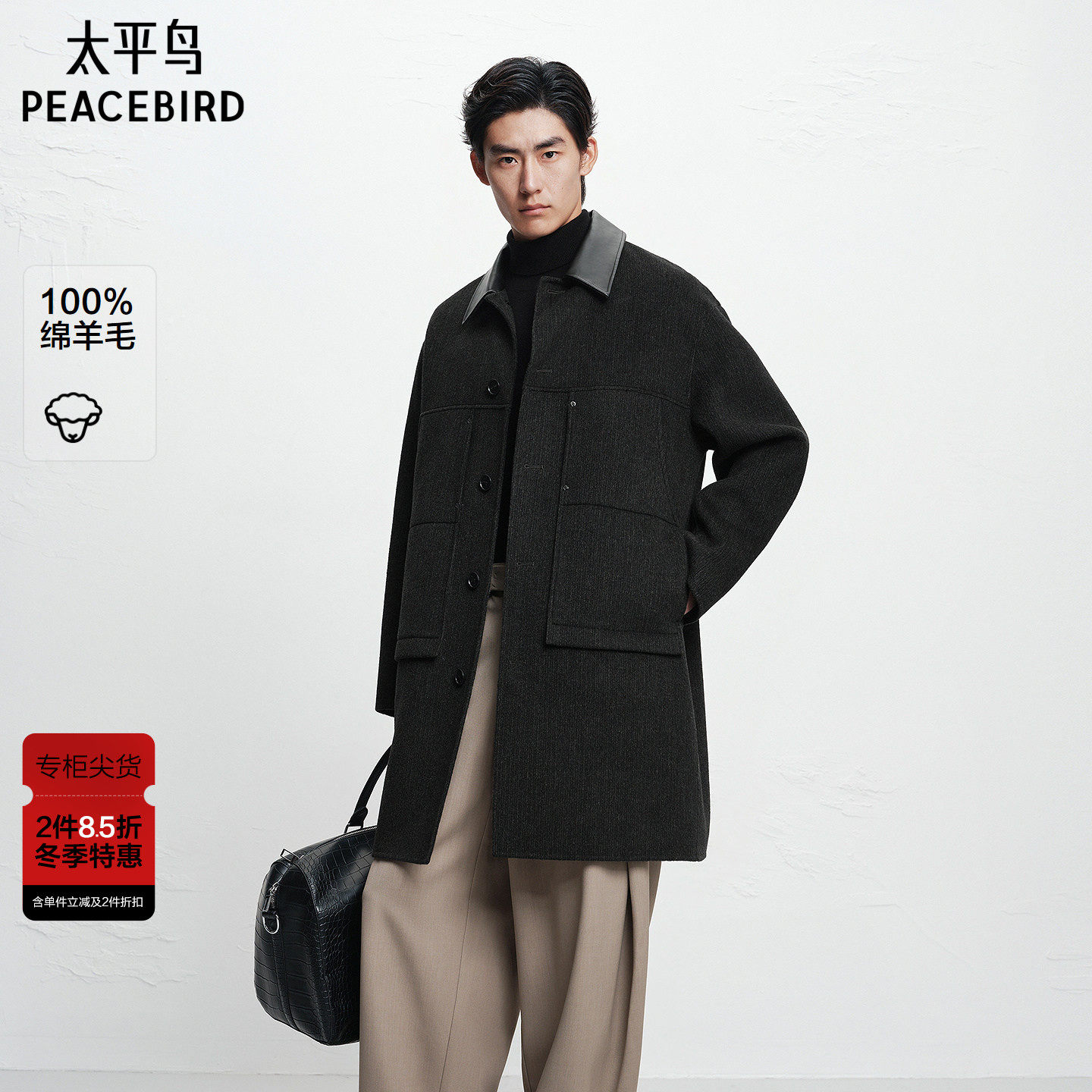 【商场同款】太平鸟男装休闲毛呢大衣巴恩风PU领大衣 B1AAF4414@