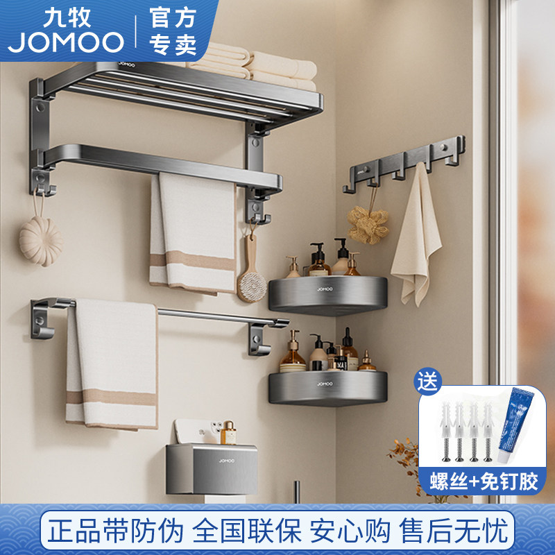 九牧官方正品浴巾架折叠毛巾杆五金挂件套装置物免打孔浴室太空铝