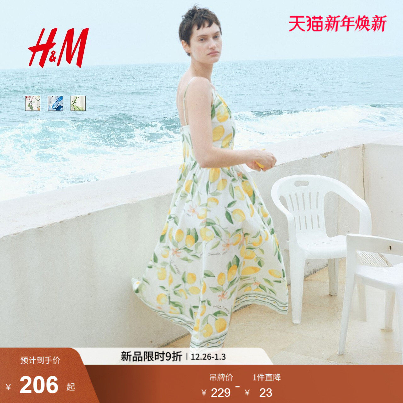HM女装连衣裙2025冬新款V领修身A字度假吊带植物印花长裙1278036