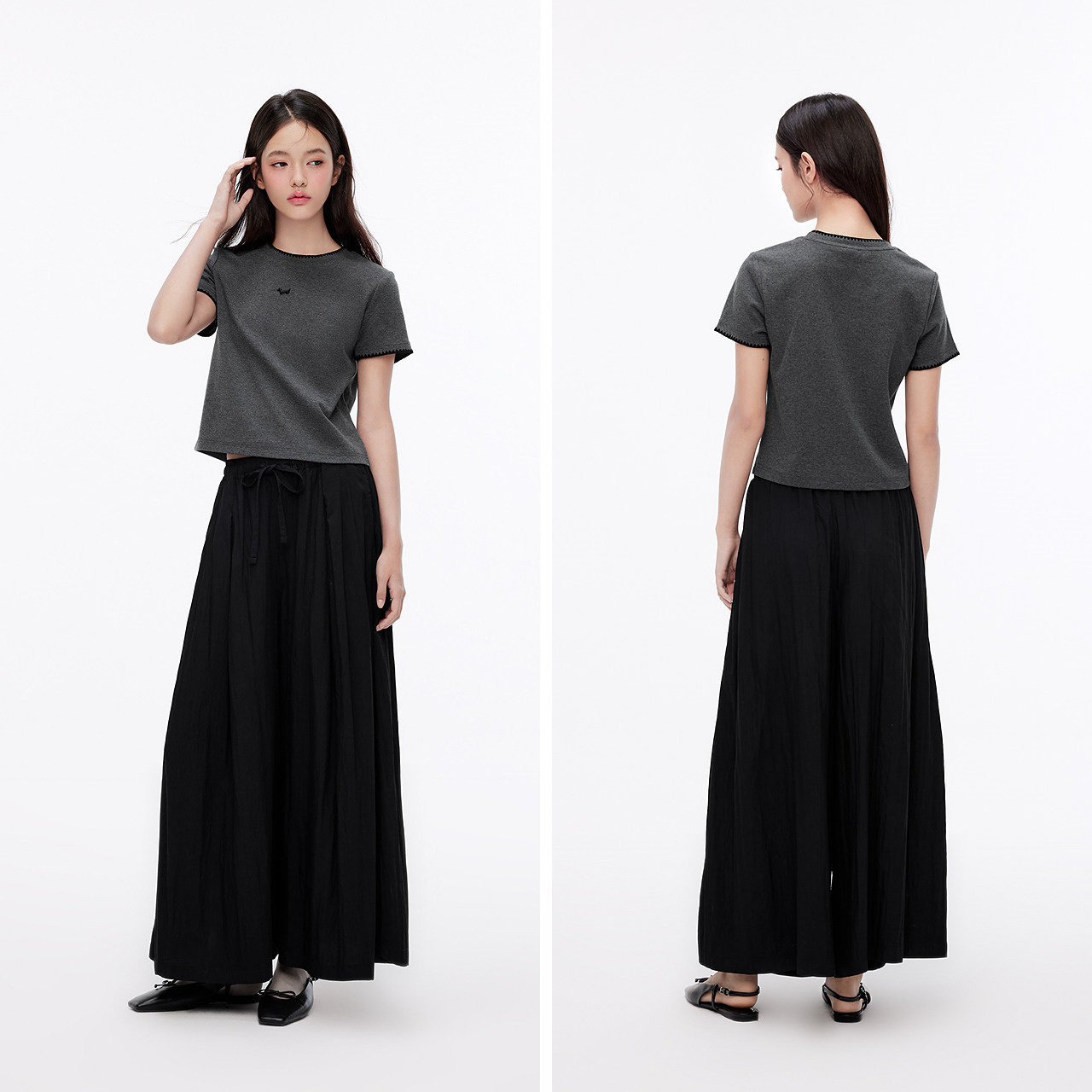 三福短袖T恤女2026新款夏季褶皱设计感修身圆领短款白色上衣女装