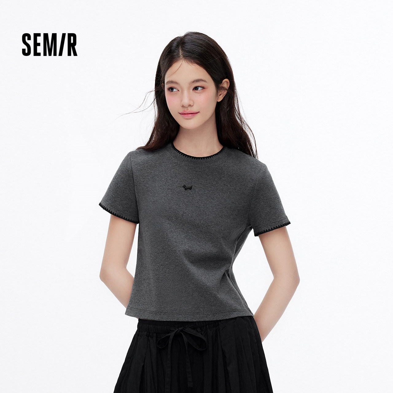 森马短袖T恤女夏短款小狗修身正肩刺绣套头衫小个子时尚简约上衣