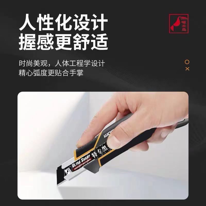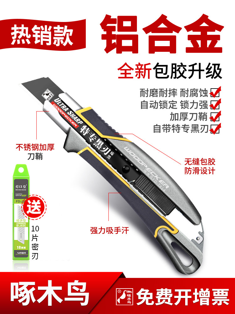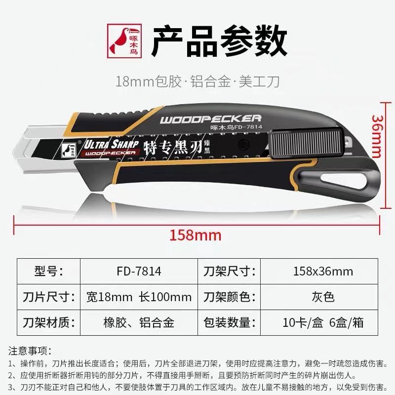 啄木鸟美工刀架FD7814包胶铝合金大号加厚壁纸刀不锈钢重型工业用加厚锋利耐用配套FD-306A加厚刀片全黑片刀