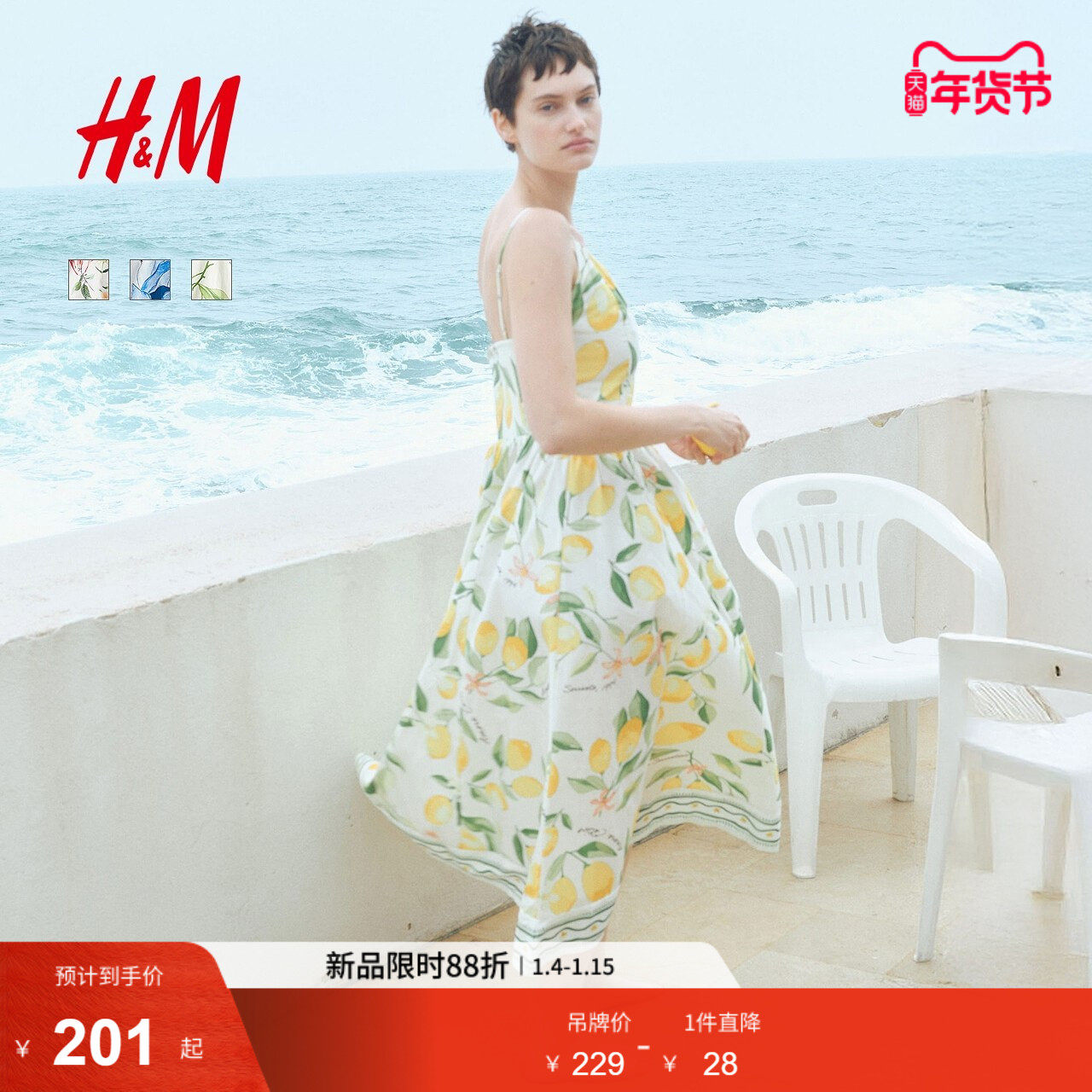 HM女装连衣裙春季V领修身A字度假吊带植物印花长裙1278036