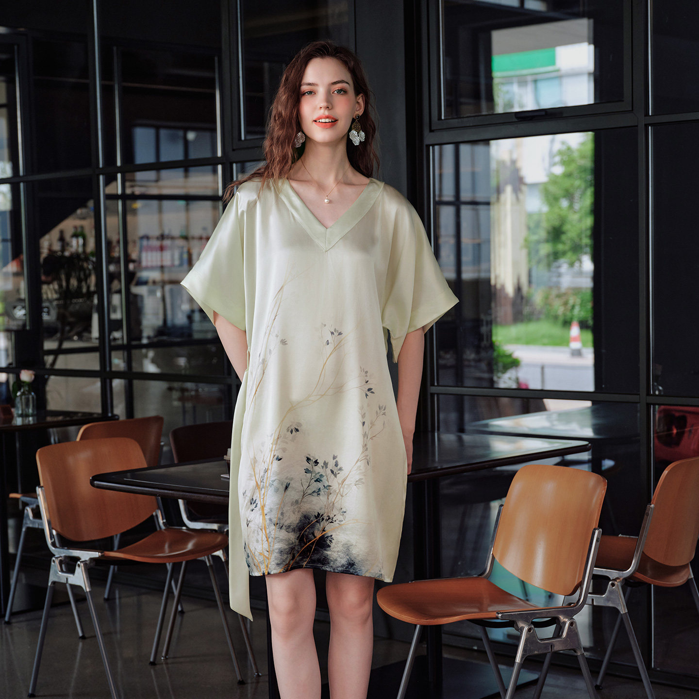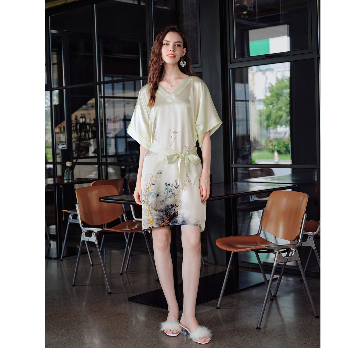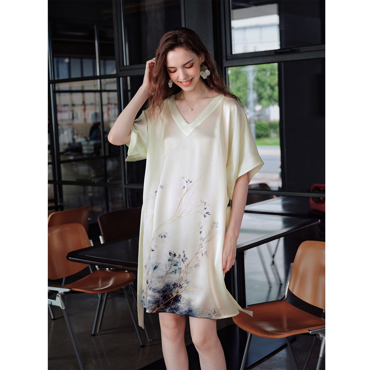 美标新款短袖真丝睡裙女士春夏中国风睡衣100%桑蚕丝蝙蝠衫家居服