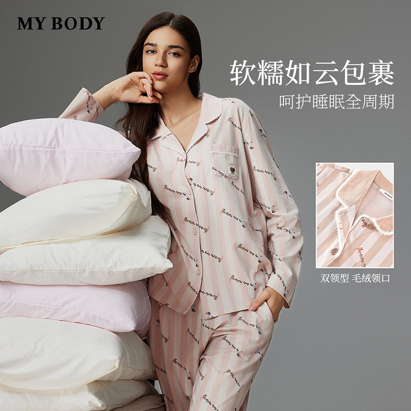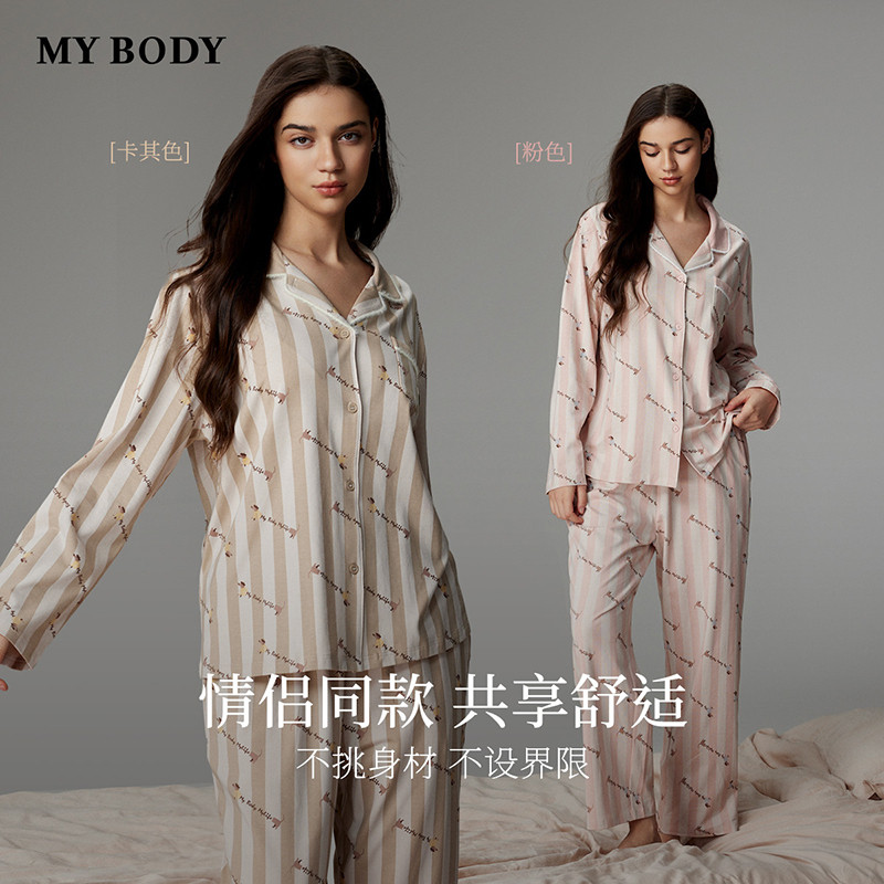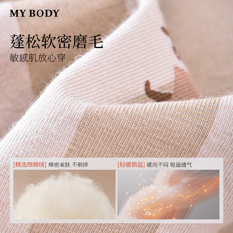 MYBODY商场同款睡衣套装情侣款印花可外穿棉质磨毛长袖长裤家居服
