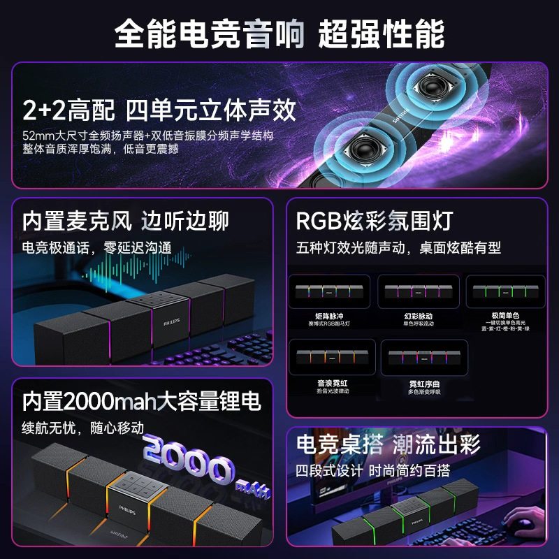 飞利浦电脑音响SPA5600台式家用蓝牙电竞音箱低音炮高音质RGB游戏