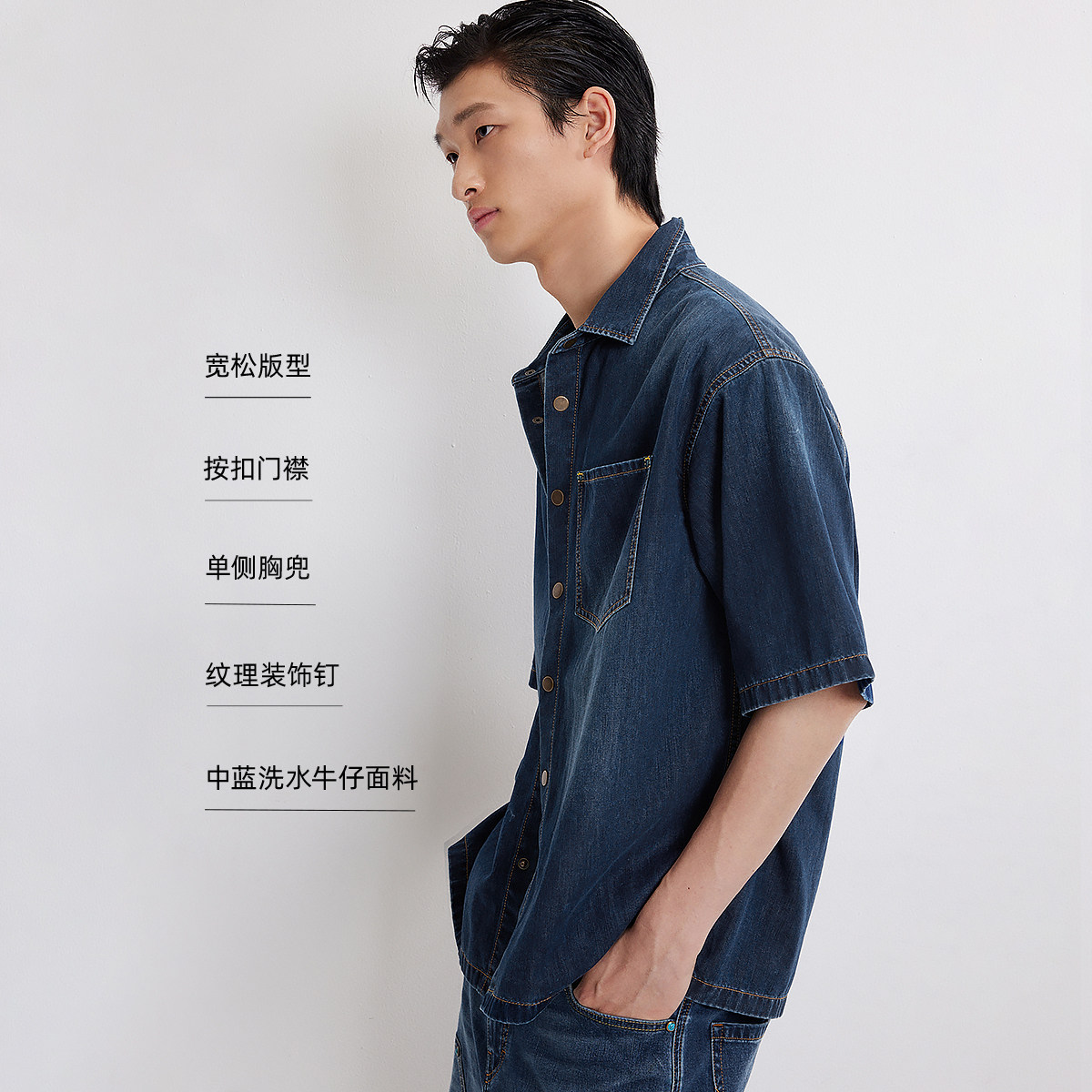 宽松版型;纹理装饰钉;凉感面料;摁扣门襟