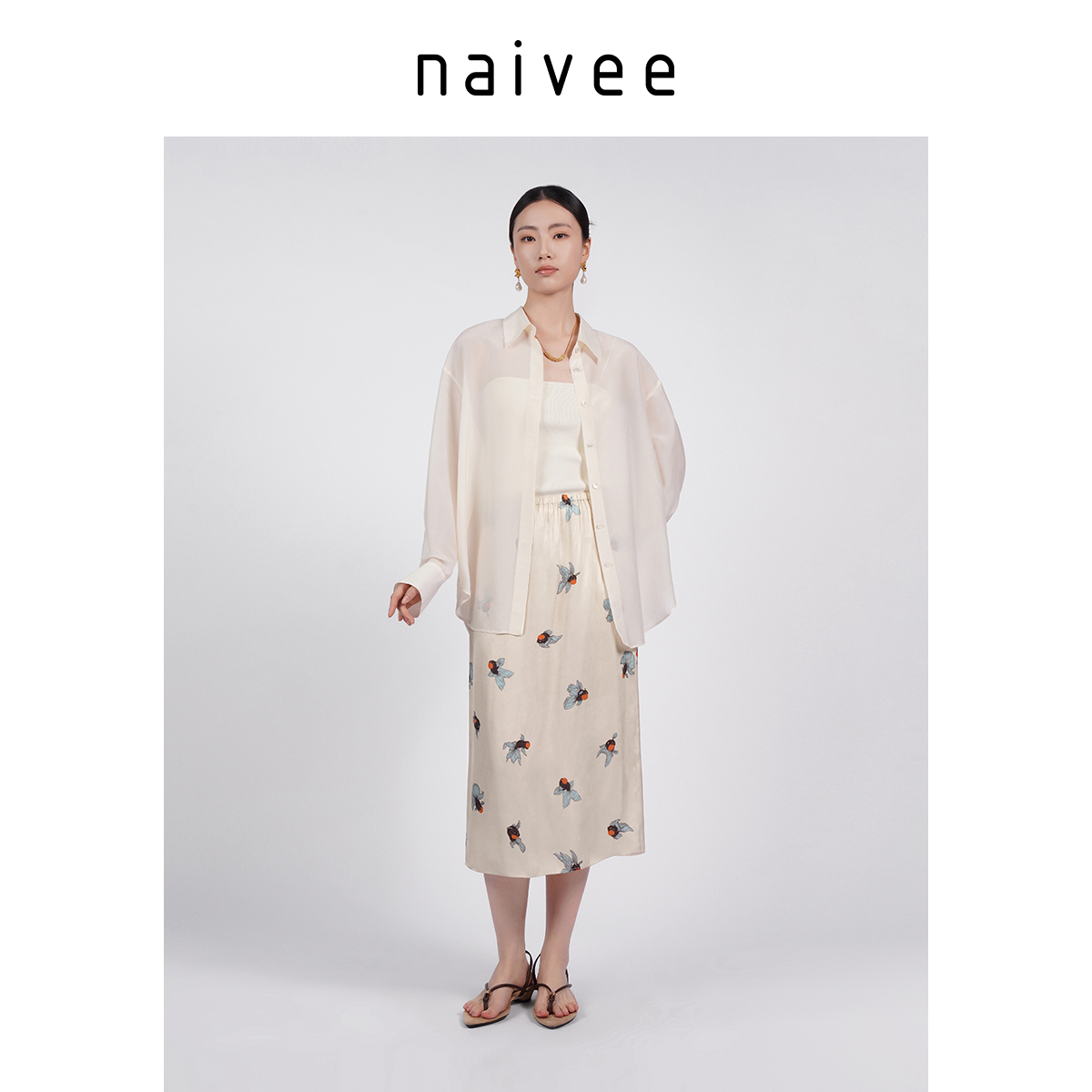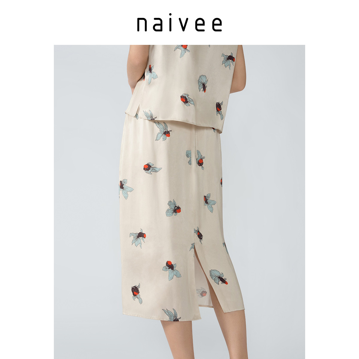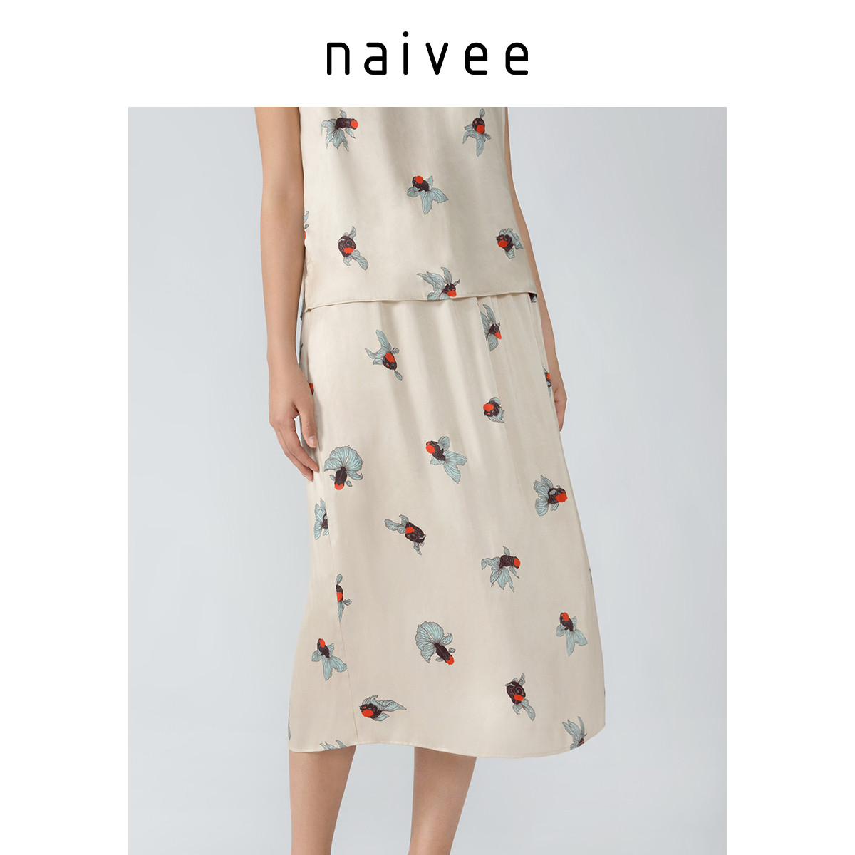 天丝半身裙』naivee直筒裙中长款25夏新款中式吉祥游鱼印花松紧腰
