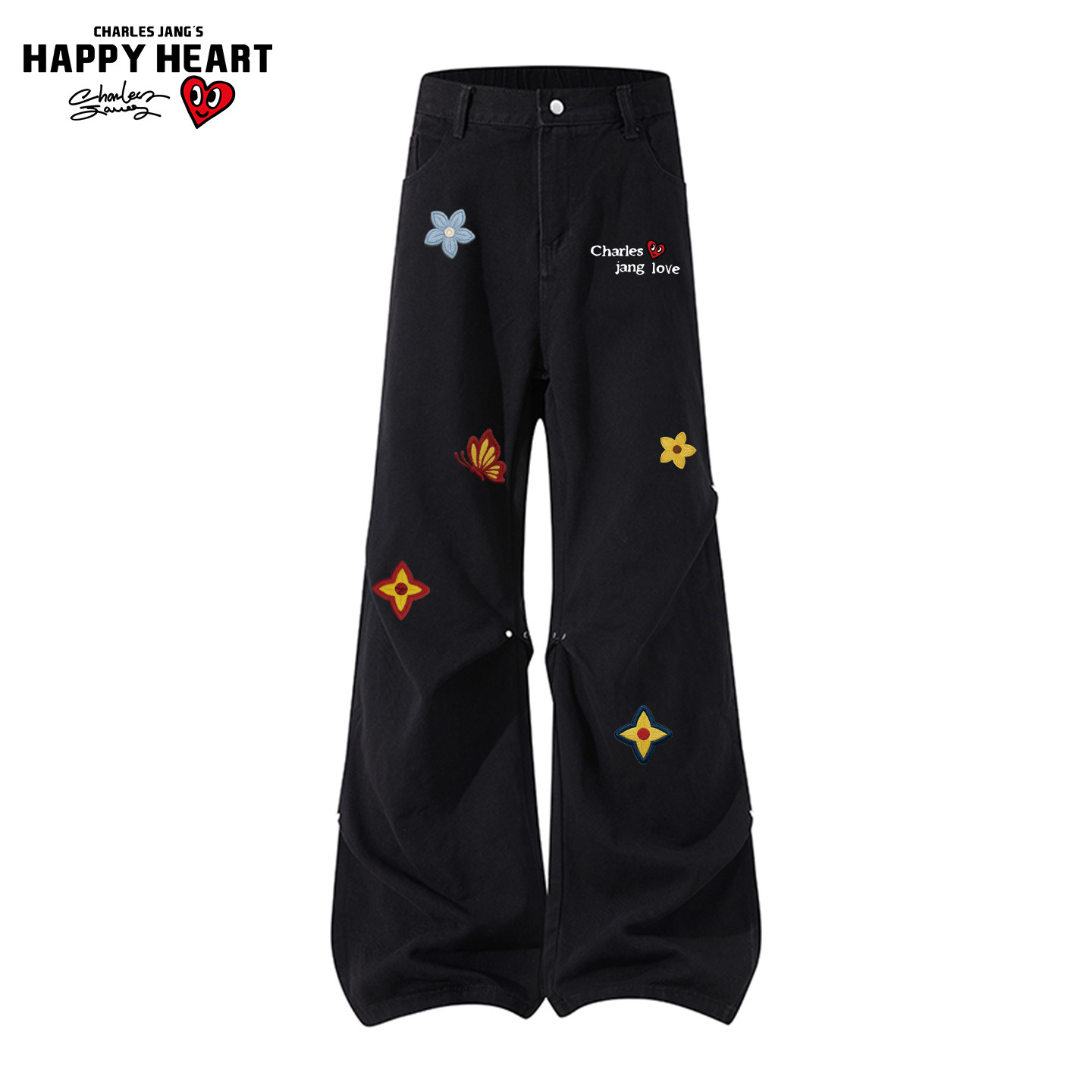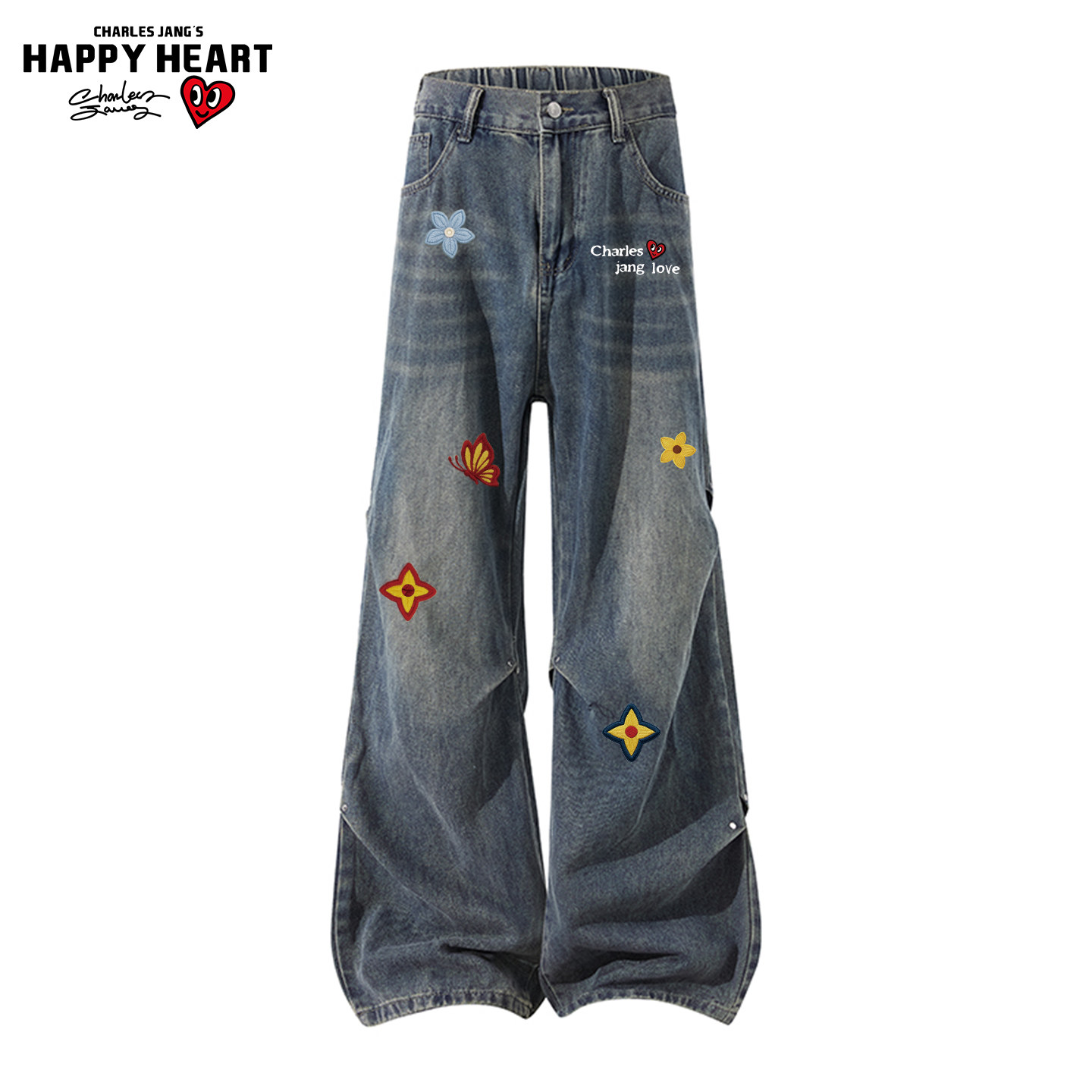 查尔斯桃心 美式花卉印花铆钉褶皱牛仔裤男女款春秋冬季直筒长裤