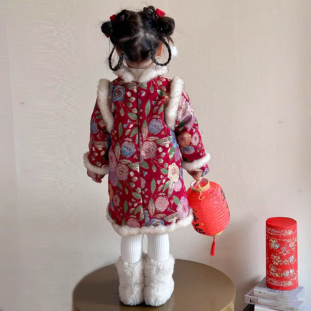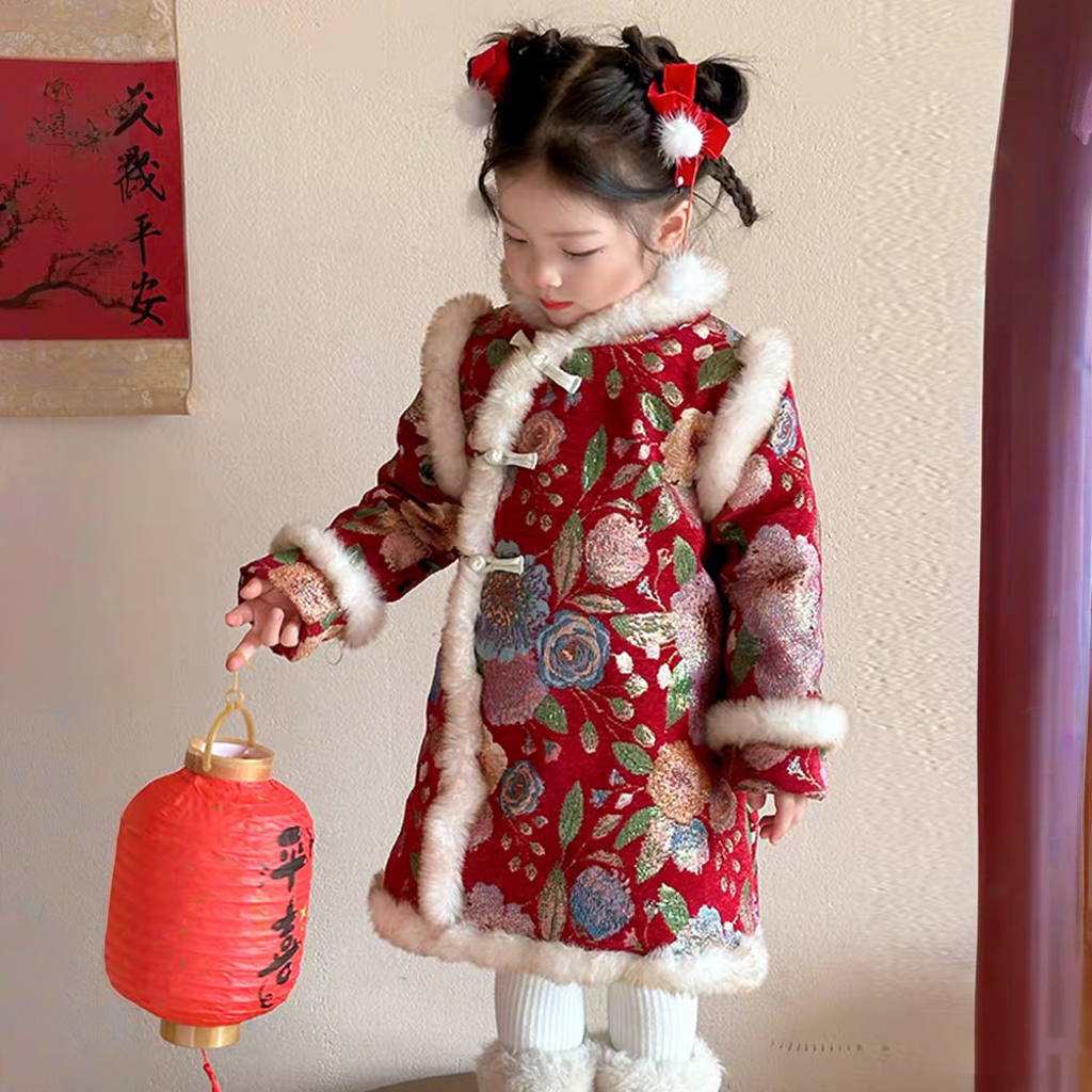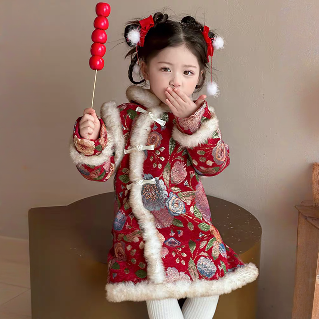 女童连衣裙国风冬季宝宝冬装红色新年服装儿童过年拜年服旗袍裙子