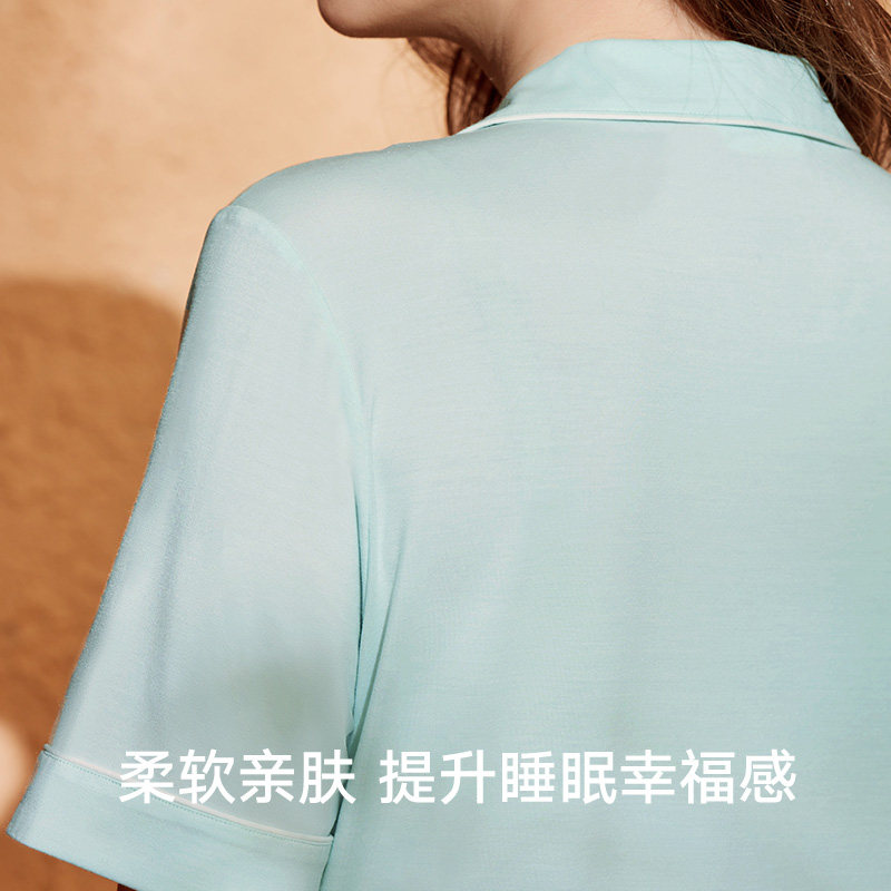 曼妮芬V领夏季短袖长裤套装女士家居起居服舒适睡衣睡裤20310876