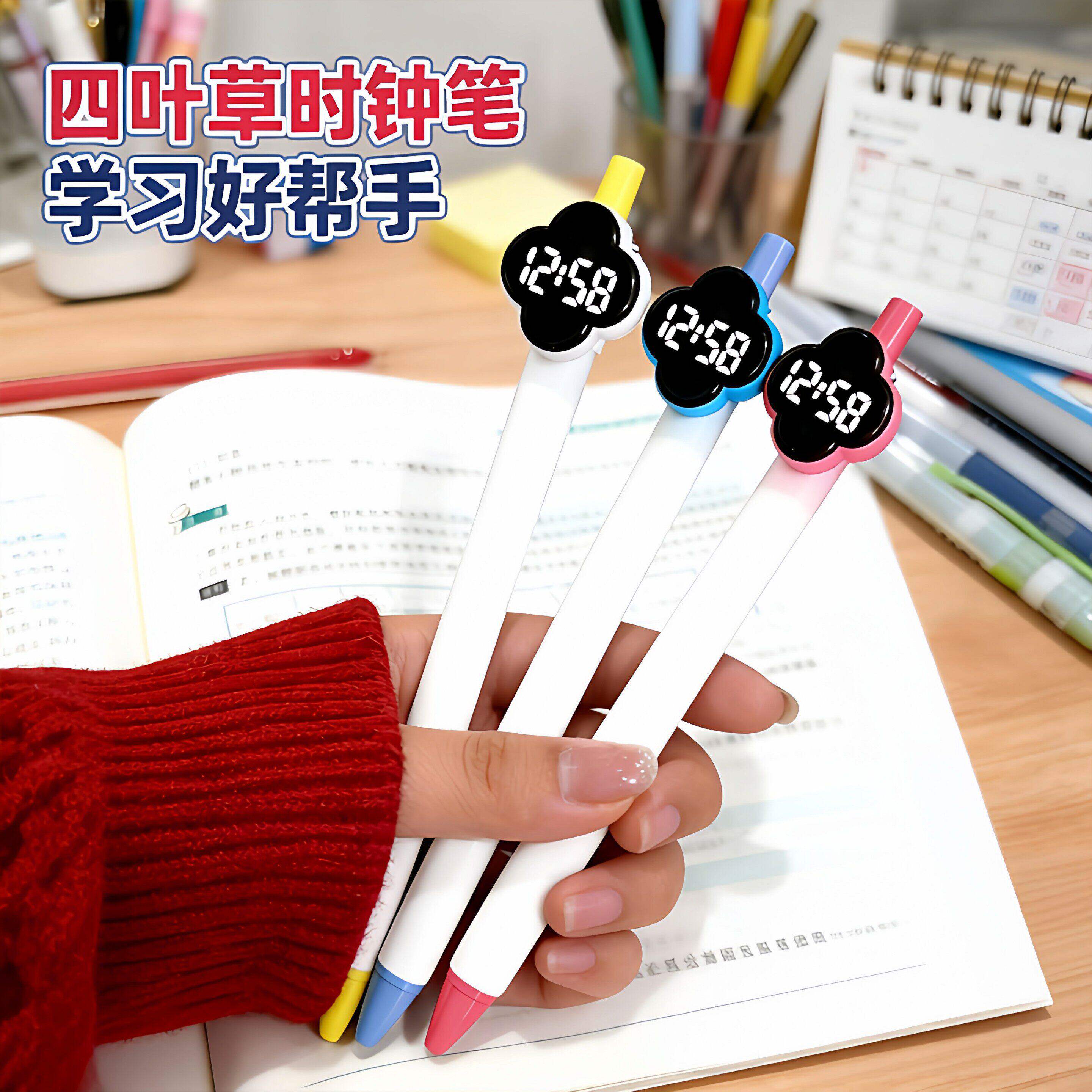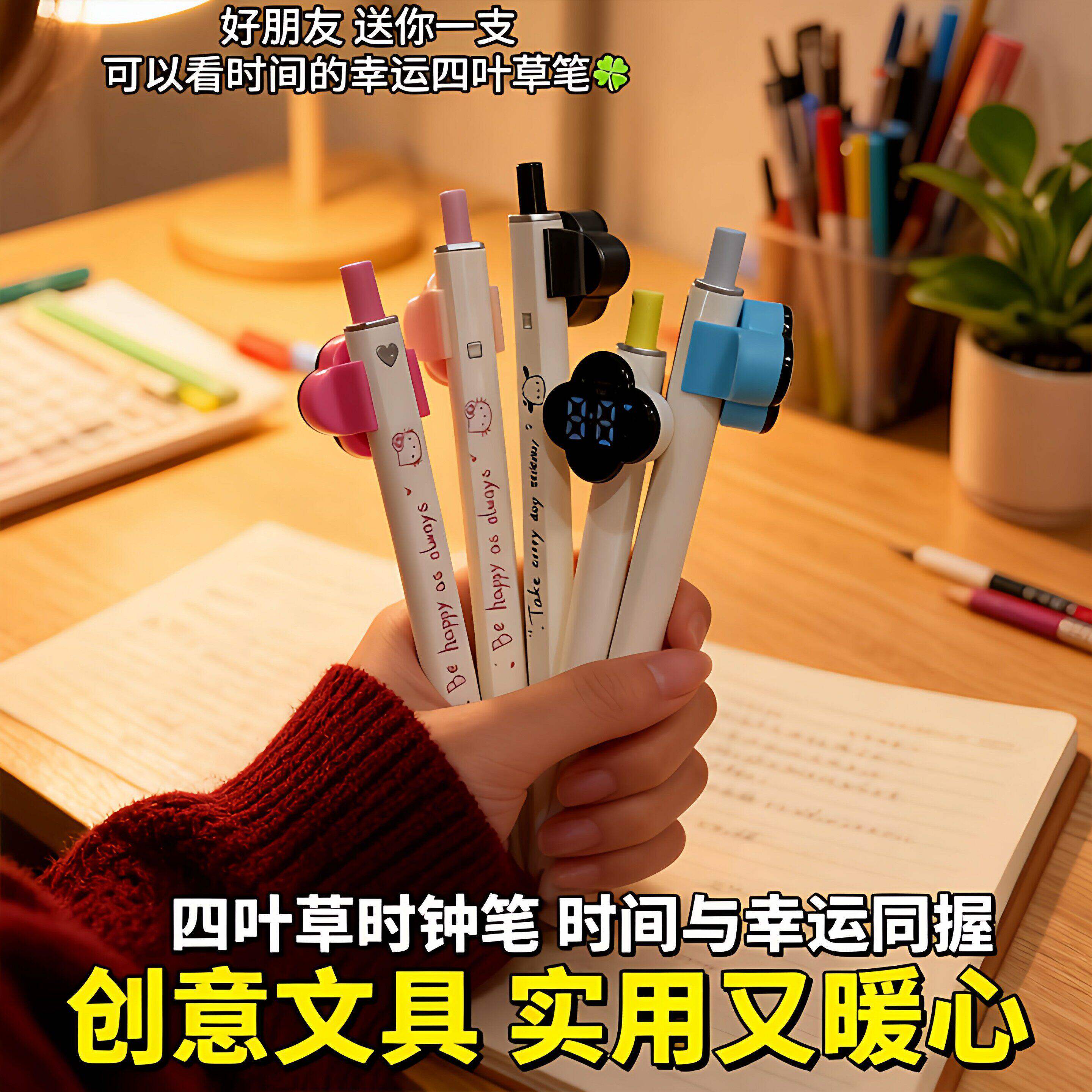 幸运四叶草时间笔小时钟按压笔静音可看时学生LED中性笔黑笔文具