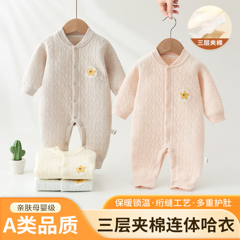 婧麒新生儿婴儿衣服秋冬夹棉满月纯棉初生宝宝秋装连体衣a类爬服