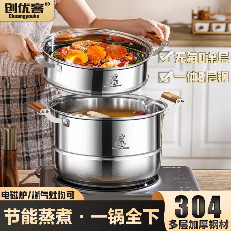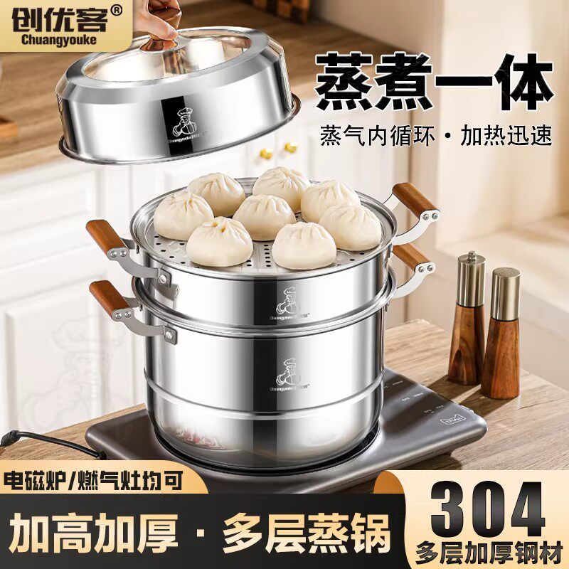 创优客蒸锅304不锈钢馒头家用食品级汤锅加厚电磁炉通用三层