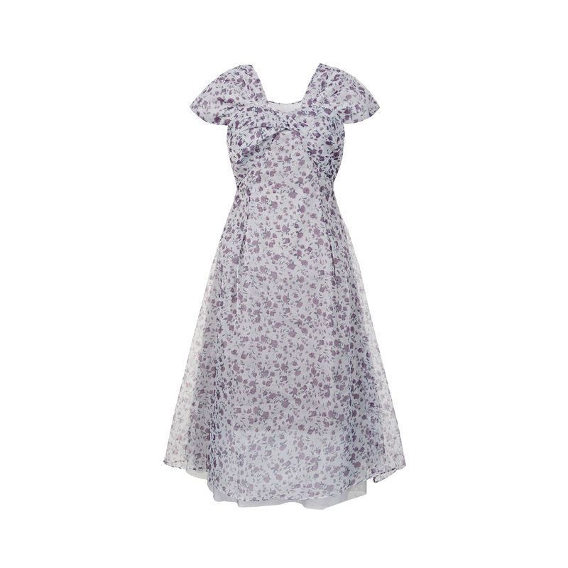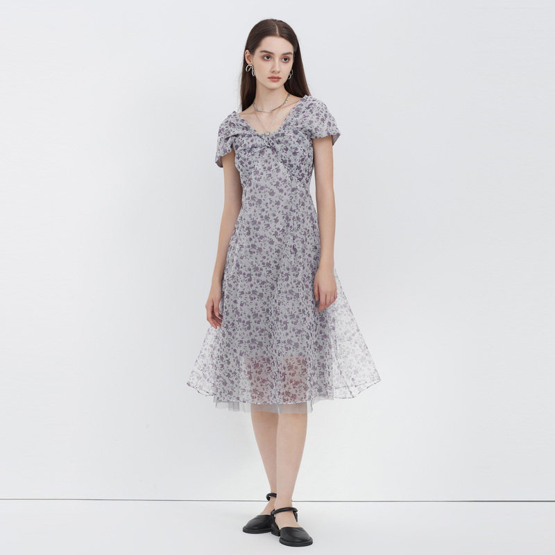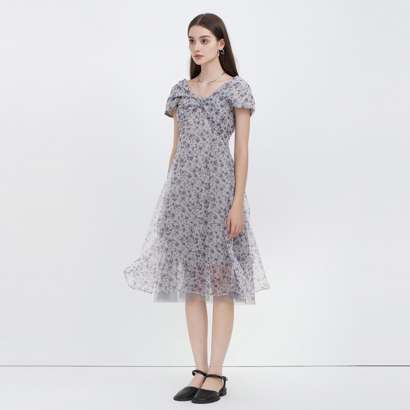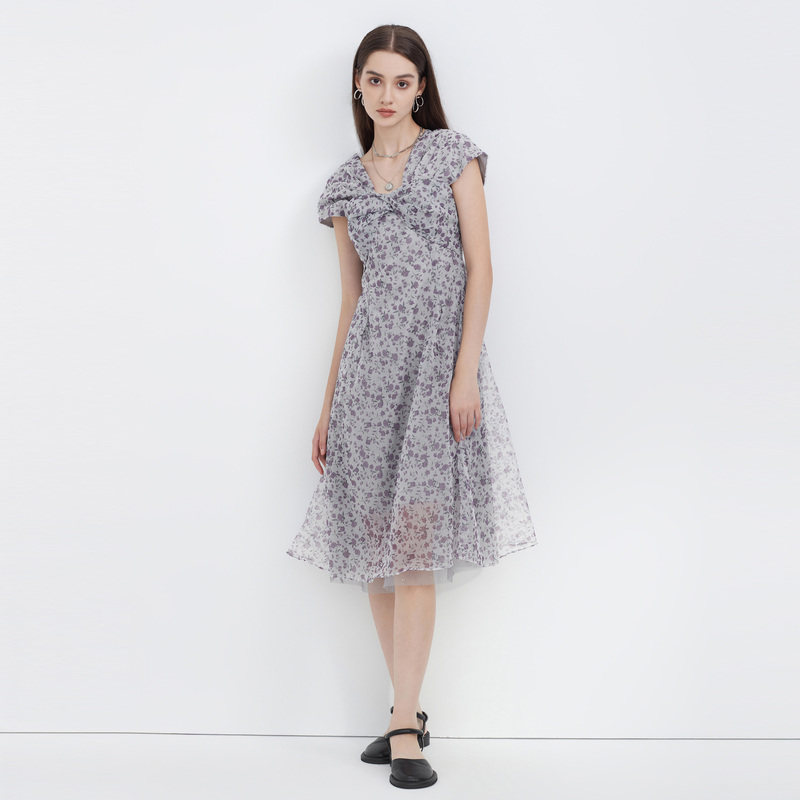 雨菲2025夏新款碎花v领飞飞边清冷大美人设计感显瘦斜裁连衣裙女