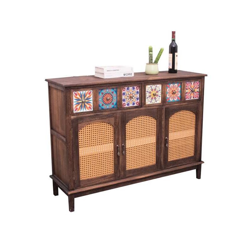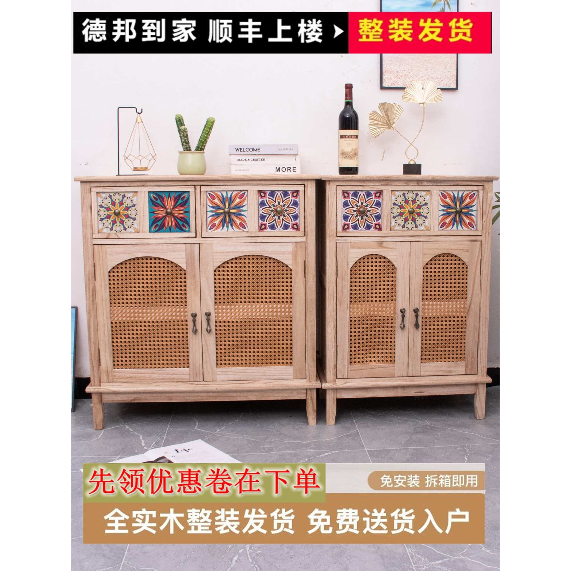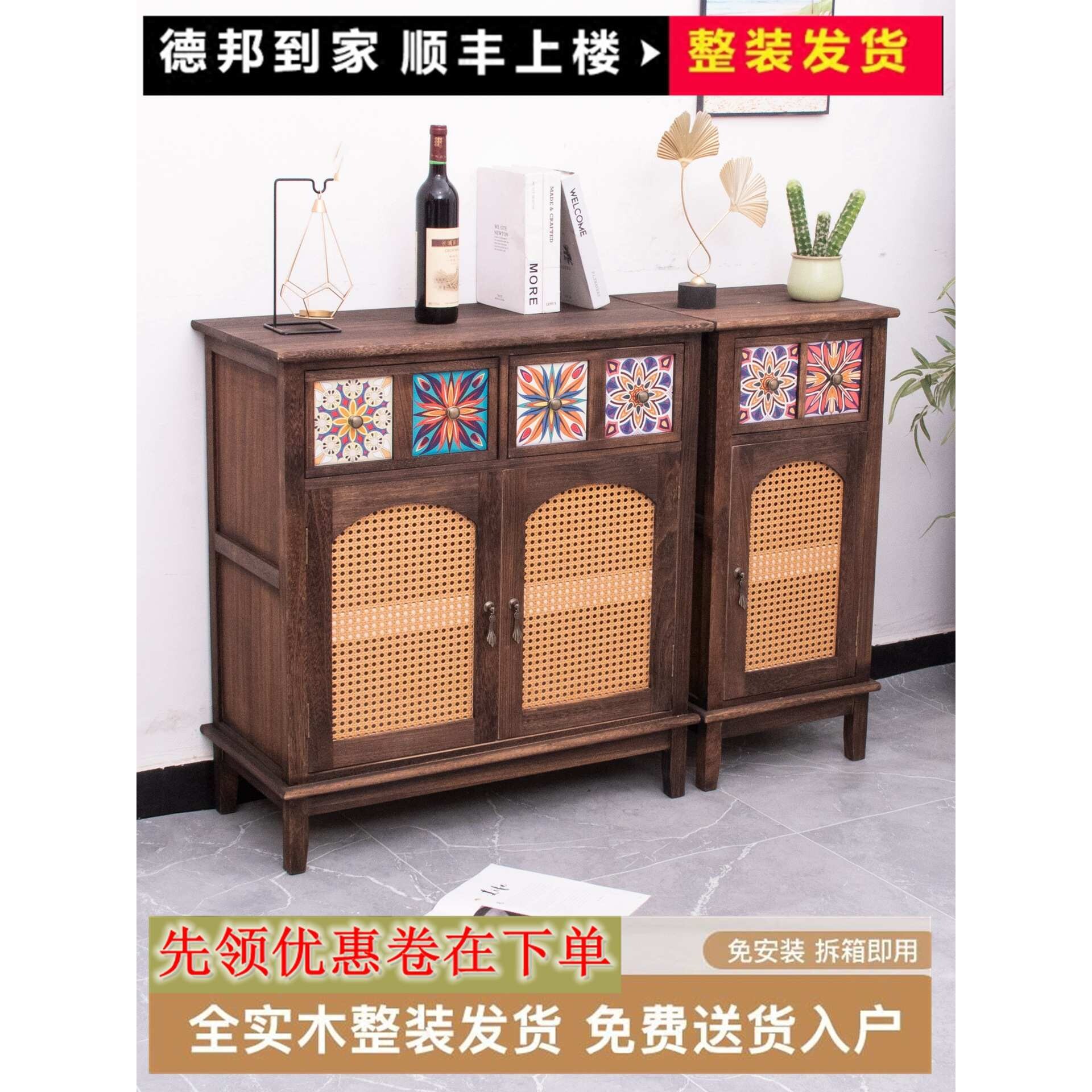 全实木餐边柜家用藤编斗柜茶水柜复古玄关柜客厅靠墙收纳储物柜J&
