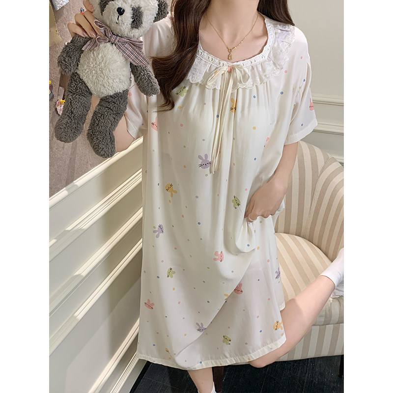 韩版加长款棉绸睡裙女士短袖加大码睡衣夏季人造棉宽松舒适居家服